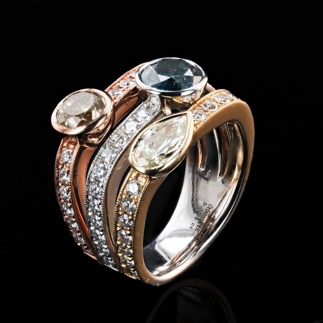 2.81ctw Fancy Light Yellow, Blue and Brown CENTER Diamond 14K Yellow, White and Rose Gold Ring (3.94ctw Diamonds). One polished, stamped, and tested 14K yellow, white, and rose gold ring with a bright finish. The ring is mounted with 3 genuine diamond center stones weighing approximately 2.81 carats, and 53 genuine round diamonds weighing approximately 1.13 carats. This item weighs 12.1 grams, condition is new, excellent workmanship. MAIN GEMSTONES Identity: Natural Diamond Shape: Pear / Round Cutting Style: Brilliant Cut Quantity: 3 Diamonds Measurements: 7.9 x 3.8mm (1 pear), 5.7 - 6.6mm (2 round) Total Weight: 2.81 carats Color Grade: Fancy Blue, Fancy Brown, Fancy Light Yellow Clarity Grade: I1 - I2 Cut Grade: Very Good Refractive Index: 2.417 Hardness: 10 ADJACENT GEMSTONES ON RING Identity: Natural Diamond Shape: Round Cutting Style: Brilliant Cut Quantity: 53 Diamonds Measurements: 1.7 - 1.8mm Total Weight: 1.13 carats Color Grade: F - G Clarity Grade: VS1 - SI1 Refractive Index: 2.418 Hardness: 10 TOTAL DIAMOND WEIGHT: 3.94 cts WEIGHT OF ITEM: 12.1 grams GOLD CONTENT: 14K Yellow, White and Rose Gold