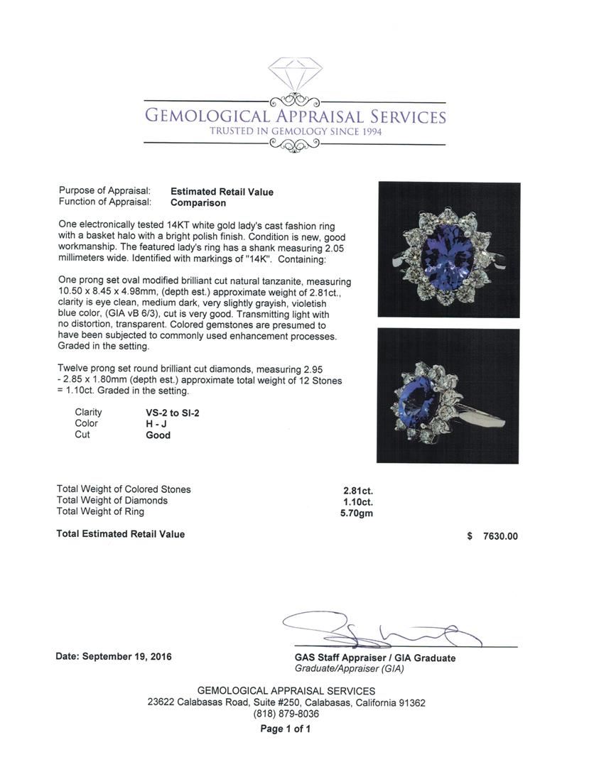 One electronically tested 14KT white gold lady's cast fashion ring with a basket halo with a bright polish finish. The featured lady's ring has a shank measuring 2.05 millimeters wide. Identified with markings of '14K'. Condition is new, good workmanship. Containing: One prong set oval modified brilliant cut natural tanzanite, measuring 10.50 x 8.45 x 4.98mm, (depth est.) approximate weight of 2.81ct., clarity is eye clean, medium dark, very slightly grayish, violetish blue color, (GIA vB 6/3), cut is very good. Transmitting light with no distortion, transparent. Colored gemstones are presumed to have been subjected to commonly used enhancement processes. Graded in the setting. Twelve prong set round brilliant cut diamonds, measuring 2.95 - 2.85 x 1.80mm (depth est.) approximate total weight of 12 Stones = 1.10ct. Graded in the setting. Clarity VS-2 to SI-2. Color: H - J Cut Good. Total Weight of Colored Stones 2.81ct.. Total Weight of Diamonds 1.10ct.. Total Weight of Ring 5.70gm. GAS Appraised at $7,630.00.