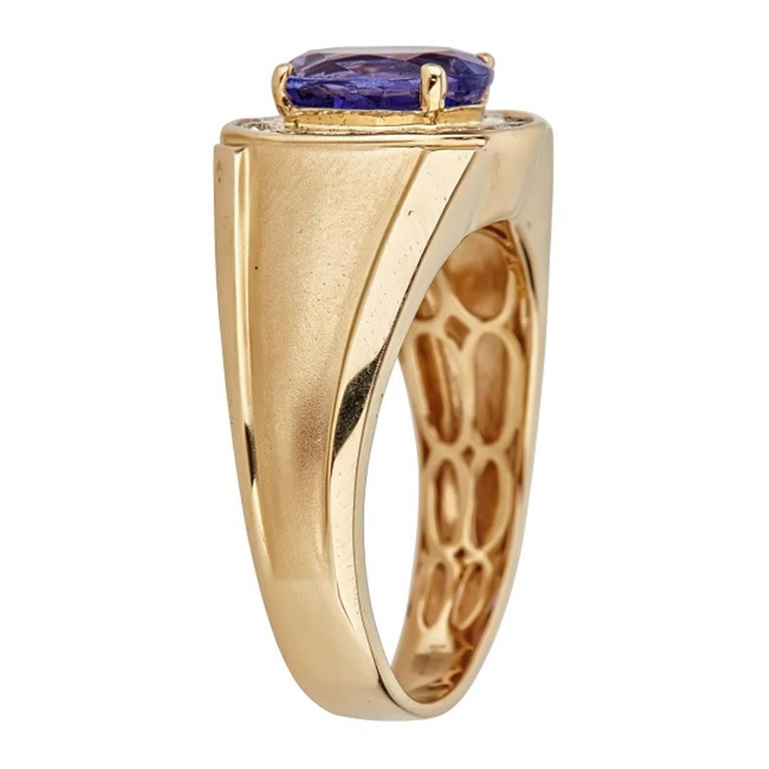 One Tanzanite and Diamond Ring featuring: 14KT Yellow Gold with a total weight of 7.98 grams, Tanzanite with a total weight of 2.81ct, and 22 Diamonds with a total weight of 0.32ctw.