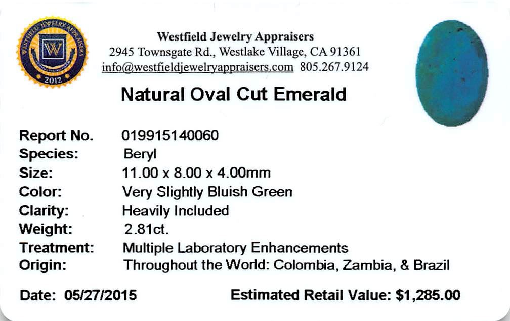 One oval mixed cut natural emerald, measuring 11.00 x 8.00 x 4.00mm, exact weight 2.81ct., clarity is heavily included, type III, medium dark, very slightly grayish, very slightly bluish green color, (GIA vslbG 6/3), cut is good. Transmitting light somewhat diffusely, translucent, Naturally occurring internal & external characteristics are present, Indications of multiple laboratory enhancements, including high temperature heat treatment. Westfield Appraised at $1,285.00.