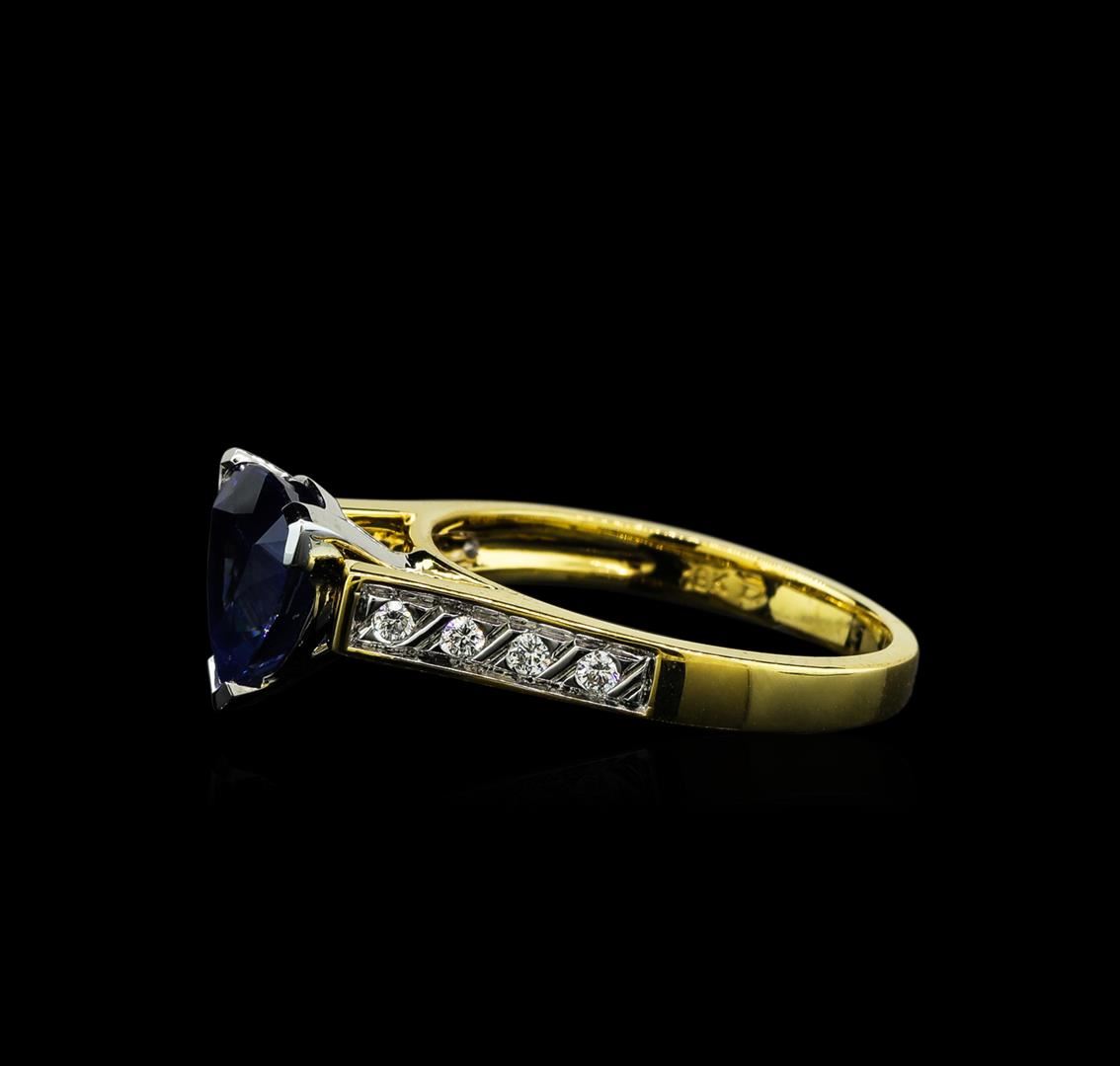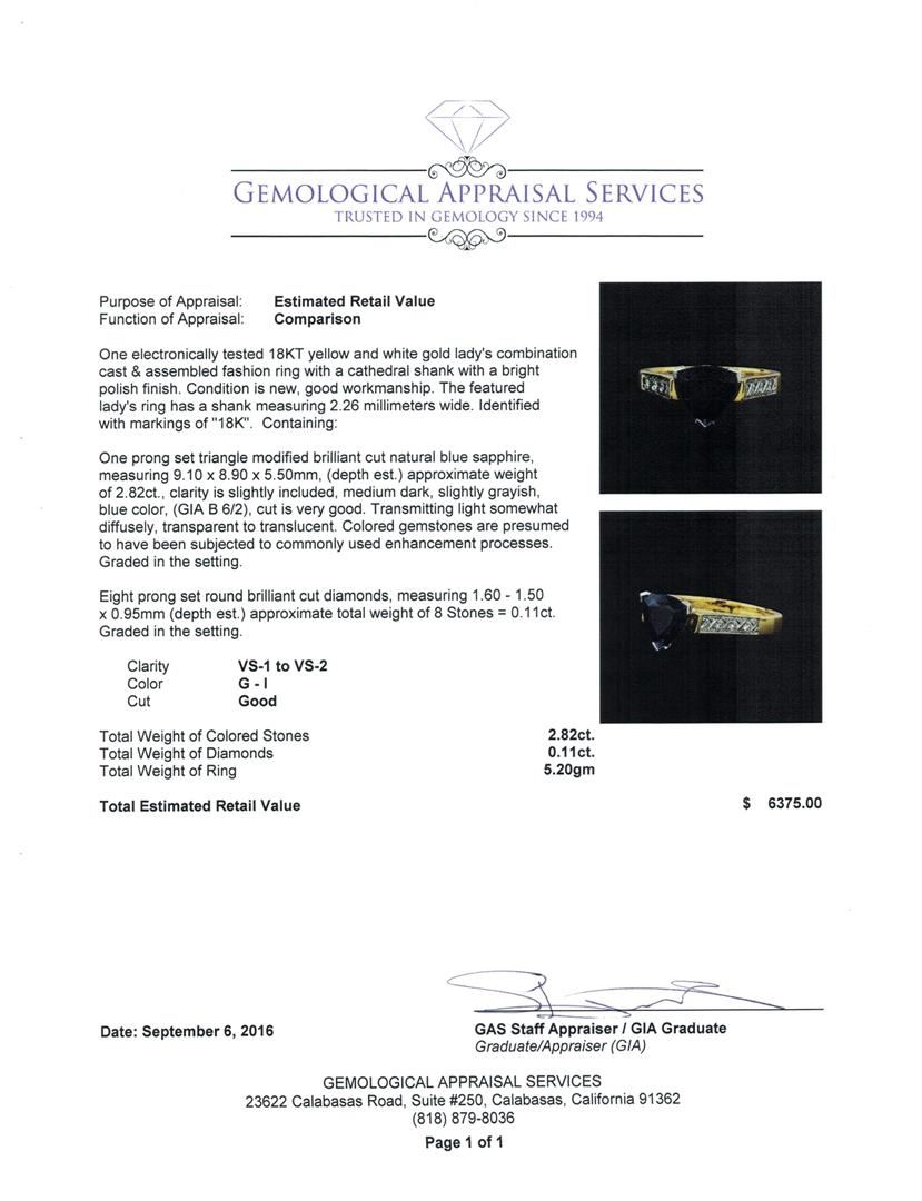 One electronically tested 18KT yellow and white gold lady's combination cast & assembled fashion ring with a cathedral shank with a bright polish finish. The featured lady's ring has a shank measuring 2.26 millimeters wide. Identified with markings of '18K'. Condition is new, good workmanship. Containing: One prong set triangle modified brilliant cut natural blue sapphire, measuring 9.10 x 8.90 x 5.50mm, (depth est.) approximate weight of 2.82ct., clarity is slightly included, medium dark, slightly grayish, blue color, (GIA B 6/2), cut is very good. Transmitting light somewhat diffusely, transparent to translucent. Colored gemstones are presumed to have been subjected to commonly used enhancement processes. Graded in the setting. Eight prong set round brilliant cut diamonds, measuring 1.60 - 1.50 x 0.95mm (depth est.) approximate total weight of 8 Stones = 0.11ct. Graded in the setting. Clarity VS-1 to VS-2. Color: G - I Cut Good. Total Weight of Colored Stones 2.82ct.. Total Weight of Diamonds 0.11ct.. Total Weight of Ring 5.20gm GAS Appraised at $6,375.00.