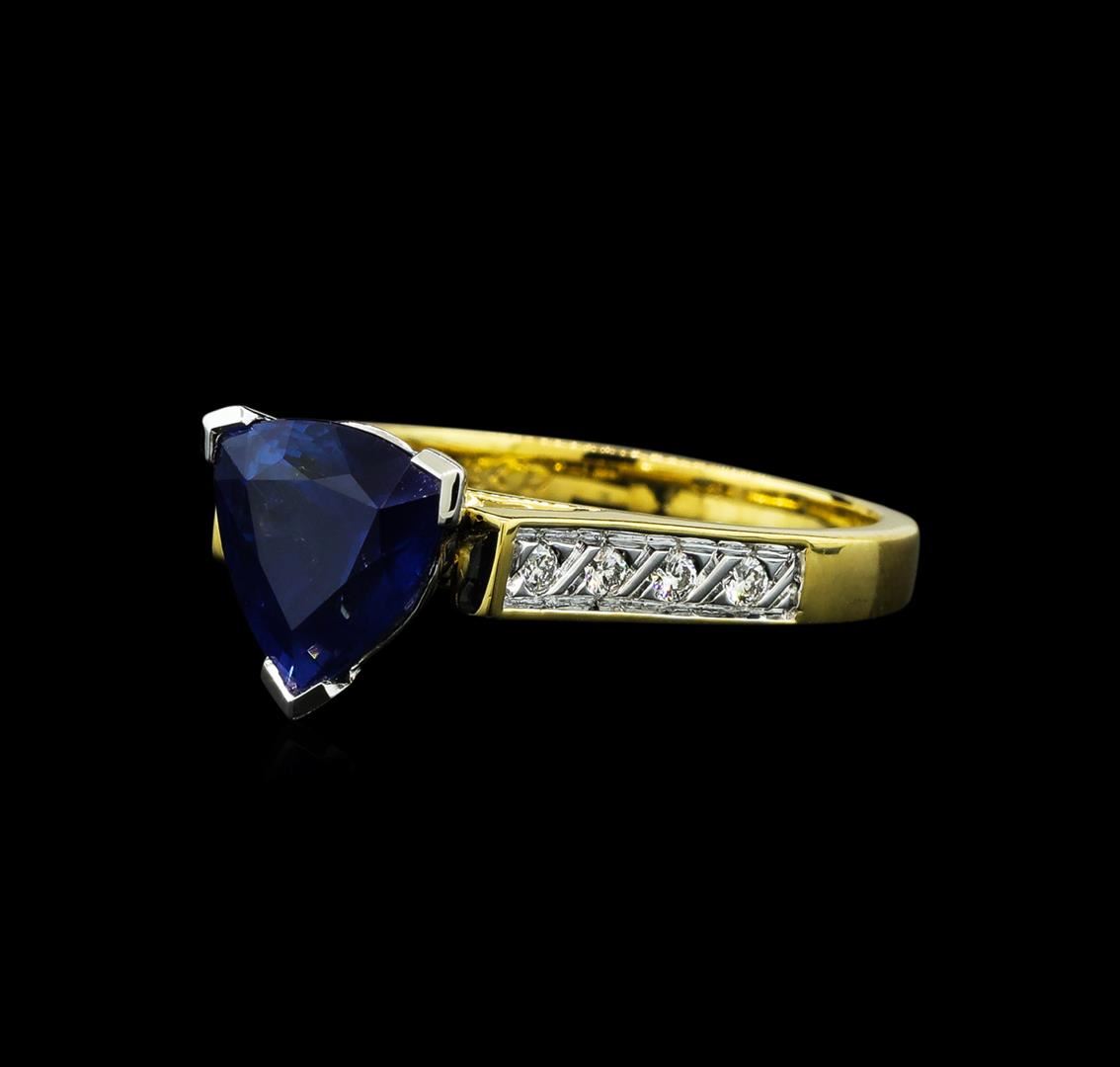 One electronically tested 18KT yellow and white gold lady's combination cast & assembled fashion ring with a cathedral shank with a bright polish finish. The featured lady's ring has a shank measuring 2.26 millimeters wide. Identified with markings of '18K'. Condition is new, good workmanship. Containing: One prong set triangle modified brilliant cut natural blue sapphire, measuring 9.10 x 8.90 x 5.50mm, (depth est.) approximate weight of 2.82ct., clarity is slightly included, medium dark, slightly grayish, blue color, (GIA B 6/2), cut is very good. Transmitting light somewhat diffusely, transparent to translucent. Colored gemstones are presumed to have been subjected to commonly used enhancement processes. Graded in the setting. Eight prong set round brilliant cut diamonds, measuring 1.60 - 1.50 x 0.95mm (depth est.) approximate total weight of 8 Stones = 0.11ct. Graded in the setting. Clarity VS-1 to VS-2. Color: G - I Cut Good. Total Weight of Colored Stones 2.82ct.. Total Weight of Diamonds 0.11ct.. Total Weight of Ring 5.20gm GAS Appraised at $6,375.00.
