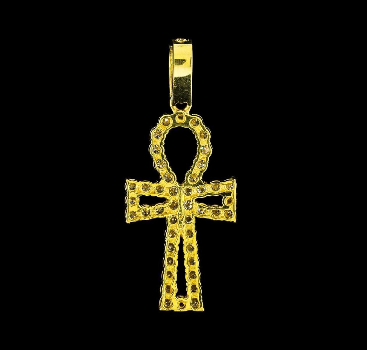 One electronically tested 14KT yellow gold cast & assembled diamond ankh pendant. The two inch length pendant features a diamond ribbon ankh, or Egyptian symbol of life, supported by a diamond set bail. Bright polish finish. Condition is good. Containing: Forty-Four prong set round brilliant cut diamonds, measuring 2.60 - 2.40 x 1.50mm (depth est.) approximate total weight of 44 Stones = 2.62ct. The clarity grade reflects the entire range of clarity for this group. Graded in the setting. Clarity SI-1 to I-2. Color: G - I Five prong set round brilliant cut diamonds, measuring 2.20 - 2.20 x 1.32mm (depth est.) approximate total weight of 5 Stones = 0.20ct. The clarity grade reflects the entire range of clarity for this group. Graded in the setting. Clarity SI-1 to I-2. Color: J - L. Total Weight of Diamonds 2.82ct.. Total Weight of Pendant 6.56gm. AIG Appraised.