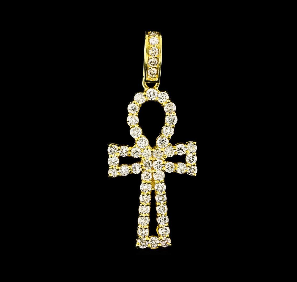 One electronically tested 14KT yellow gold cast & assembled diamond ankh pendant. The two inch length pendant features a diamond ribbon ankh, or Egyptian symbol of life, supported by a diamond set bail. Bright polish finish. Condition is good. Containing: Forty-Four prong set round brilliant cut diamonds, measuring 2.60 - 2.40 x 1.50mm (depth est.) approximate total weight of 44 Stones = 2.62ct. The clarity grade reflects the entire range of clarity for this group. Graded in the setting. Clarity SI-1 to I-2. Color: G - I Five prong set round brilliant cut diamonds, measuring 2.20 - 2.20 x 1.32mm (depth est.) approximate total weight of 5 Stones = 0.20ct. The clarity grade reflects the entire range of clarity for this group. Graded in the setting. Clarity SI-1 to I-2. Color: J - L. Total Weight of Diamonds 2.82ct.. Total Weight of Pendant 6.56gm. AIG Appraised.