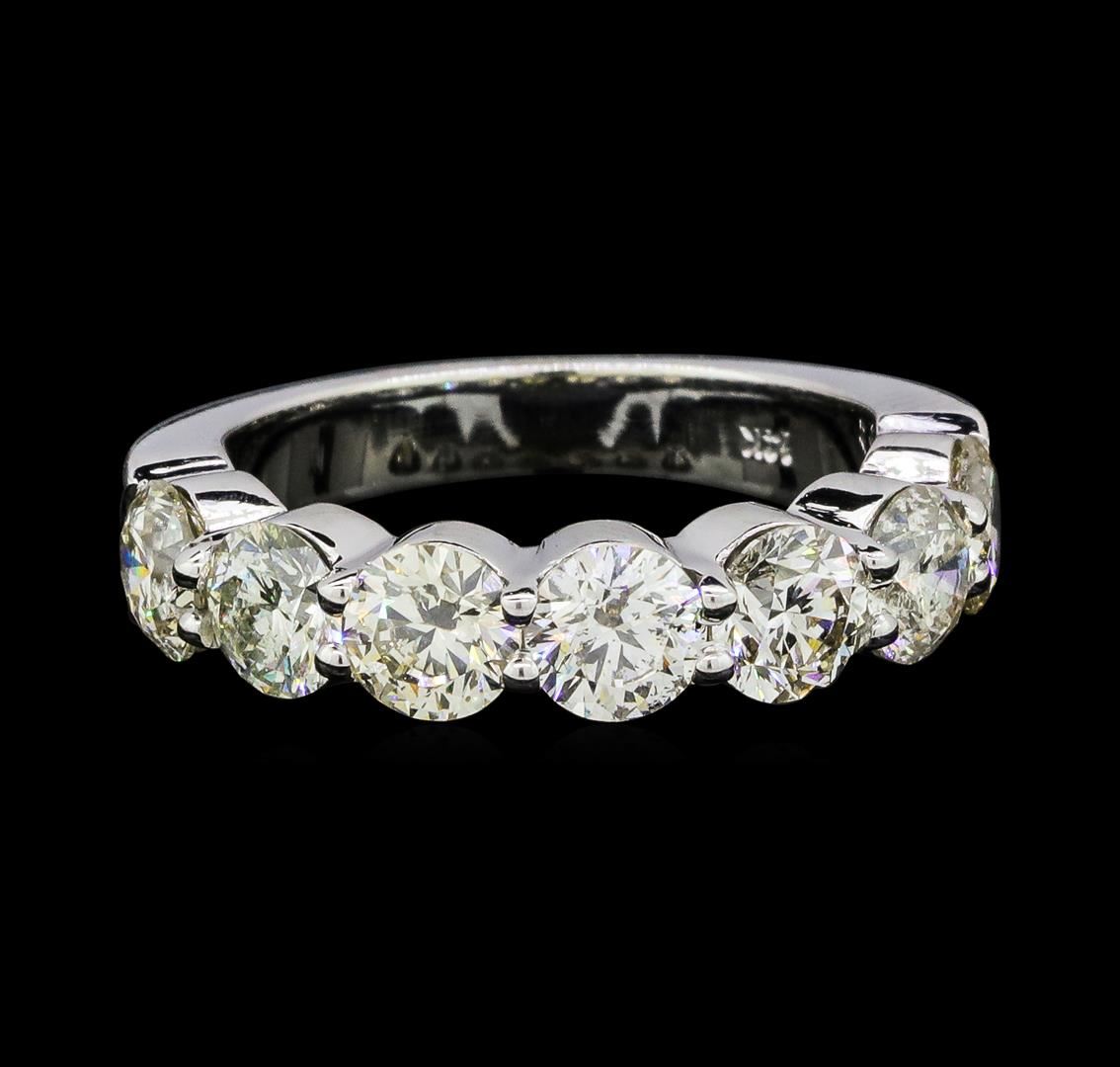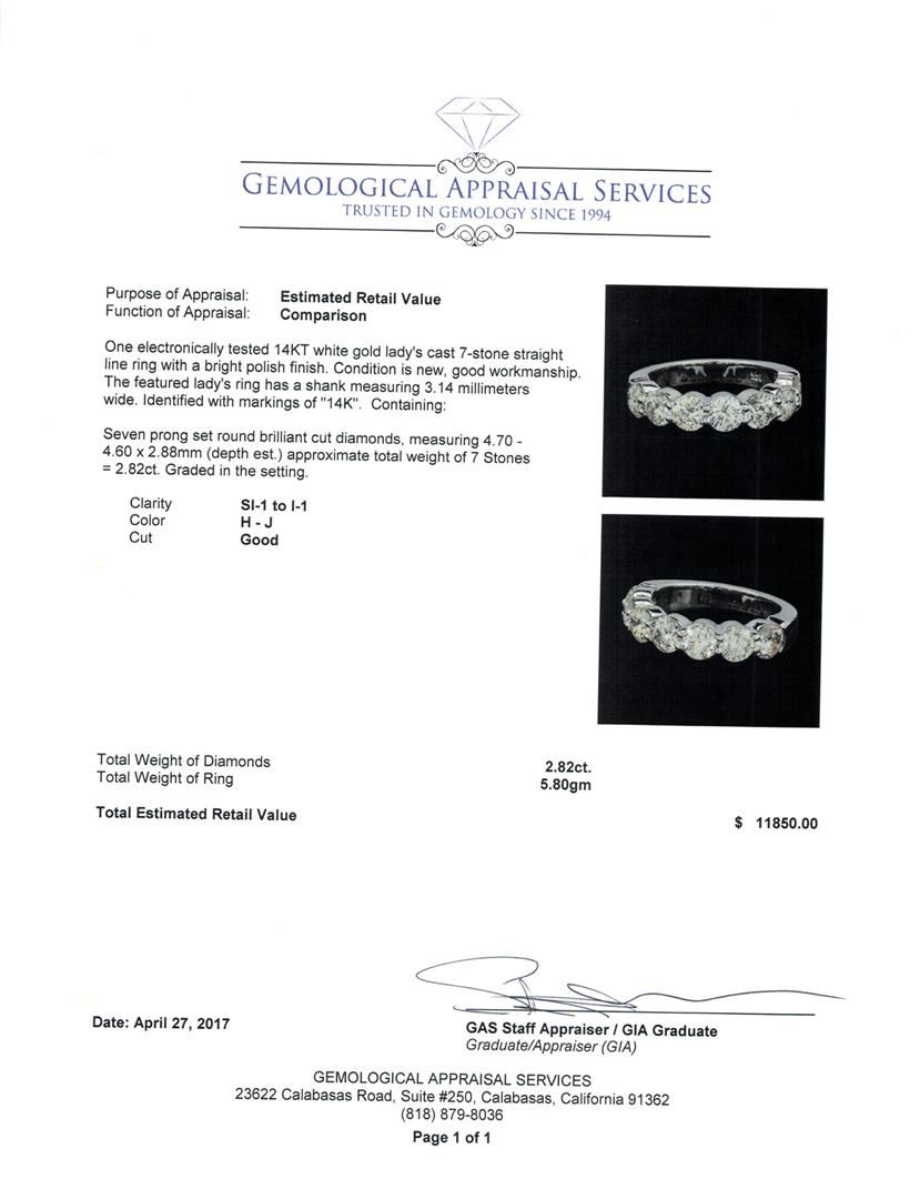One electronically tested 14KT white gold lady's cast 7-stone straight line ring with a bright polish finish. The featured lady's ring has a shank measuring 3.14 millimeters wide. Identified with markings of '14K'. Condition is new, good workmanship. Containing: Seven prong set round brilliant cut diamonds, measuring 4.70 - 4.60 x 2.88mm (depth est.) approximate total weight of 7 Stones = 2.82ct. Graded in the setting. Color H - J Clarity SI-1 to I-1 Cut Good. Total Weight of Diamonds 2.82ct.. Total Weight of Ring 5.80gm GAS Appraised at $11850.00. GAS Appraised at $11,850.00.