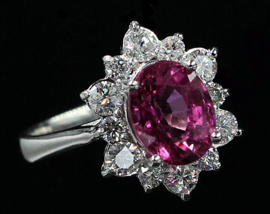 One ring featuring: 14KT white gold weighing 4.67 grams containing one pink tourmaline weighing 2.82ct and diamonds weighing 0.88ctw. The pink tourmaline is oval brilliant cut with fine clarity, pink color and excellent cut. The diamonds are round brillia