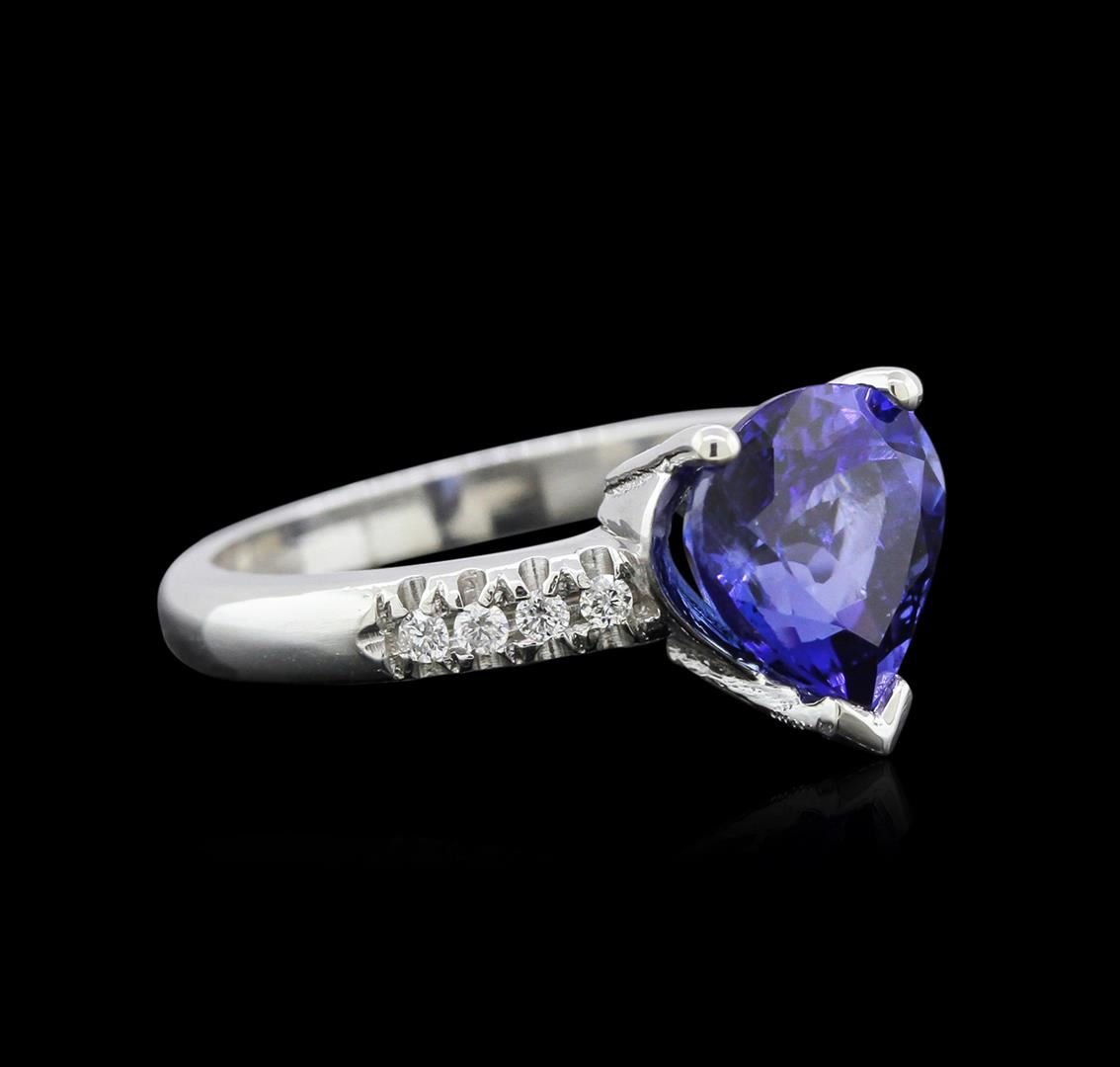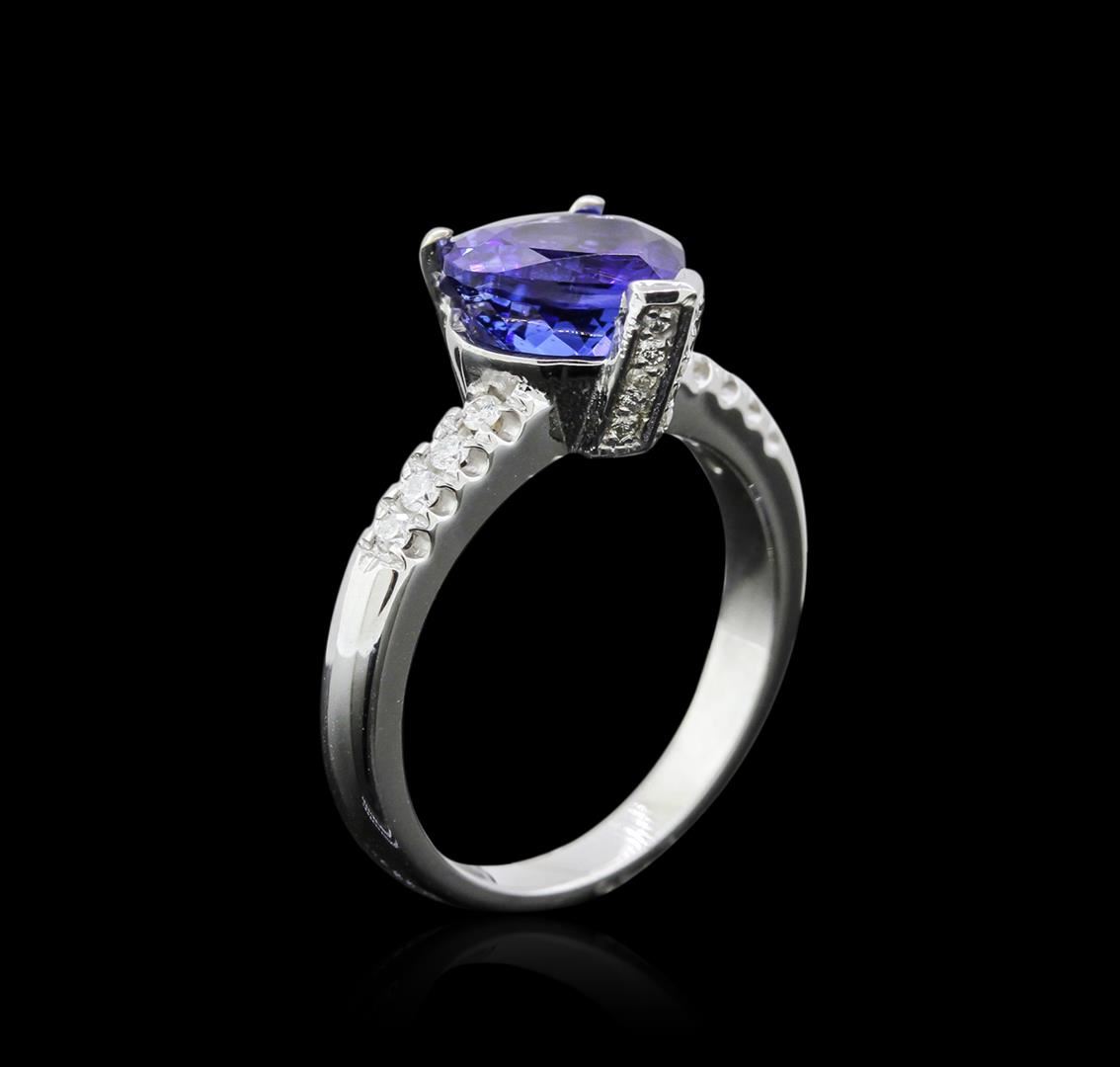 One electronically tested 14KT white gold ladies cast tanzanite and diamond ring with a bright polish finish. The featured tanzanite is set within diamond accented prongs supported by diamond set shoulders, completed by a two millimeter wide band. Identified with markings of "14K". Condition is new, good workmanship. Containing: One prong set pear mixed cut natural tanzanite approximate weight of 2.82ct., clarity is slightly included, type I, dark, moderately strong, violetish blue color, (GIA vB 7/4), cut is good. Transmitting light with a minimum of distortion, transparent. Naturally occurring internal & external characteristics are present. Graded in the setting. Tanzanite is a very rare gemstone that is only found in the country of Tanzania. Originally discovered in 1967. Tiffany & Company, named the stone Tanzanite. It is found in the Usumburu Mountains that border the Umba Valley of northern Tanzania. Tanzanite occurs in gray, brown, violet, blue, reddish-purple, & green. The gem is interesting because of its exceptional pleochroism. Rotated in different directions a tanzanite will exhibit multiple changes of color. Tanzanite has a low tolerance to ultrasonic cleaning, and should not be cleaned using this method. Eighteen prong set round brilliant cut diamonds approximate total weight of 18 Stones = 0.17ct. Graded in the setting. Clarity SI-2 to I-1 Color G - I. Total Weight of Colored Stones 2.82ct. Total Weight of Diamonds 0.17ct. Total Weight of Ring 4.91 grams. AIG Appraised at $7,260.00.