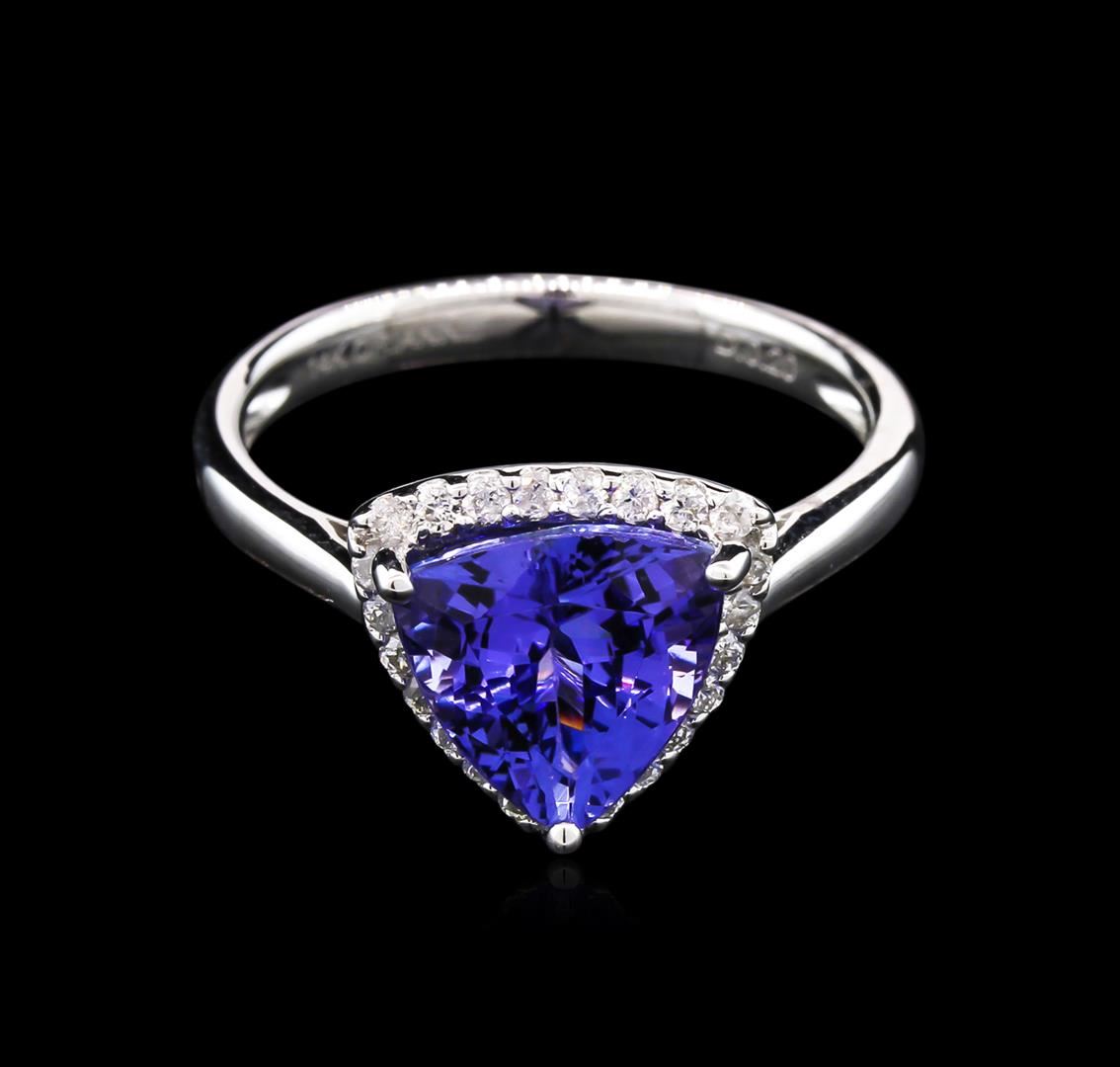 One 14KT white gold tanzanite and diamond ring. A trillion cut tanzanite zoisite gemstone is prong mounted in the center of the ring. Round brilliant cut diamonds accent the ring around and on both sides of the center gemstone. The ring is cast stamped "14K" and has a gross weight of 3.30 grams. Gemstone(s): Stone: Tanzanite zoisite. Nature: Natural. Shape: Trillion, faceted. Quantity: 1 , mounted. Weight: 2.82ct. Dimensions: 8.20 x 7.72mm. Bulge: Visible. Clarity: VS, Type 1. Color: Purplish blue (4/4). Symmetry: Very good. Color Intensity: Medium. Transparency: Transparent. Tone: Medium. Diamond(s): Shape: Round brilliant cut. Weight: 0.20ct. Average Clarity: I1. Average Color: H-J. Symmetry: Very good. Polish: Very good. GGA Appraised at $5,289.00.