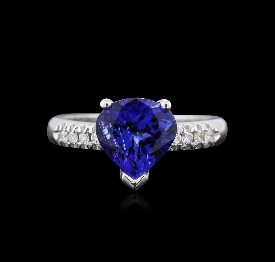 One electronically tested 14KT white gold ladies cast tanzanite and diamond ring with a bright polish finish. The featured tanzanite is set within diamond accented prongs supported by diamond set shoulders, completed by a two millimeter wide band. Identified with markings of "14K". Condition is new, good workmanship. Containing: One prong set pear mixed cut natural tanzanite approximate weight of 2.82ct., clarity is slightly included, type I, dark, moderately strong, violetish blue color, (GIA vB 7/4), cut is good. Transmitting light with a minimum of distortion, transparent. Naturally occurring internal & external characteristics are present. Graded in the setting. Tanzanite is a very rare gemstone that is only found in the country of Tanzania. Originally discovered in 1967. Tiffany & Company, named the stone Tanzanite. It is found in the Usumburu Mountains that border the Umba Valley of northern Tanzania. Tanzanite occurs in gray, brown, violet, blue, reddish-purple, & green. The gem is interesting because of its exceptional pleochroism. Rotated in different directions a tanzanite will exhibit multiple changes of color. Tanzanite has a low tolerance to ultrasonic cleaning, and should not be cleaned using this method. Eighteen prong set round brilliant cut diamonds approximate total weight of 18 Stones = 0.17ct. Graded in the setting. Clarity SI-2 to I-1 Color G - I. Total Weight of Colored Stones 2.82ct. Total Weight of Diamonds 0.17ct. Total Weight of Ring 4.91 grams. AIG Appraised at $7,260.00.