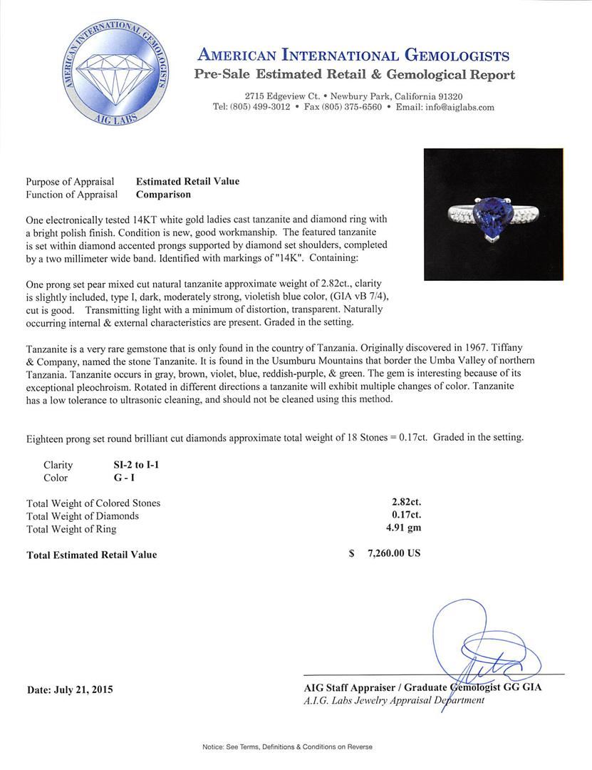 One electronically tested 14KT white gold ladies cast tanzanite and diamond ring with a bright polish finish. The featured tanzanite is set within diamond accented prongs supported by diamond set shoulders, completed by a two millimeter wide band. Identified with markings of "14K". Condition is new, good workmanship. Containing: One prong set pear mixed cut natural tanzanite approximate weight of 2.82ct., clarity is slightly included, type I, dark, moderately strong, violetish blue color, (GIA vB 7/4), cut is good. Transmitting light with a minimum of distortion, transparent. Naturally occurring internal & external characteristics are present. Graded in the setting. Tanzanite is a very rare gemstone that is only found in the country of Tanzania. Originally discovered in 1967. Tiffany & Company, named the stone Tanzanite. It is found in the Usumburu Mountains that border the Umba Valley of northern Tanzania. Tanzanite occurs in gray, brown, violet, blue, reddish-purple, & green. The gem is interesting because of its exceptional pleochroism. Rotated in different directions a tanzanite will exhibit multiple changes of color. Tanzanite has a low tolerance to ultrasonic cleaning, and should not be cleaned using this method. Eighteen prong set round brilliant cut diamonds approximate total weight of 18 Stones = 0.17ct. Graded in the setting. Clarity SI-2 to I-1 Color G - I. Total Weight of Colored Stones 2.82ct. Total Weight of Diamonds 0.17ct. Total Weight of Ring 4.91 grams. AIG Appraised at $7,260.00.