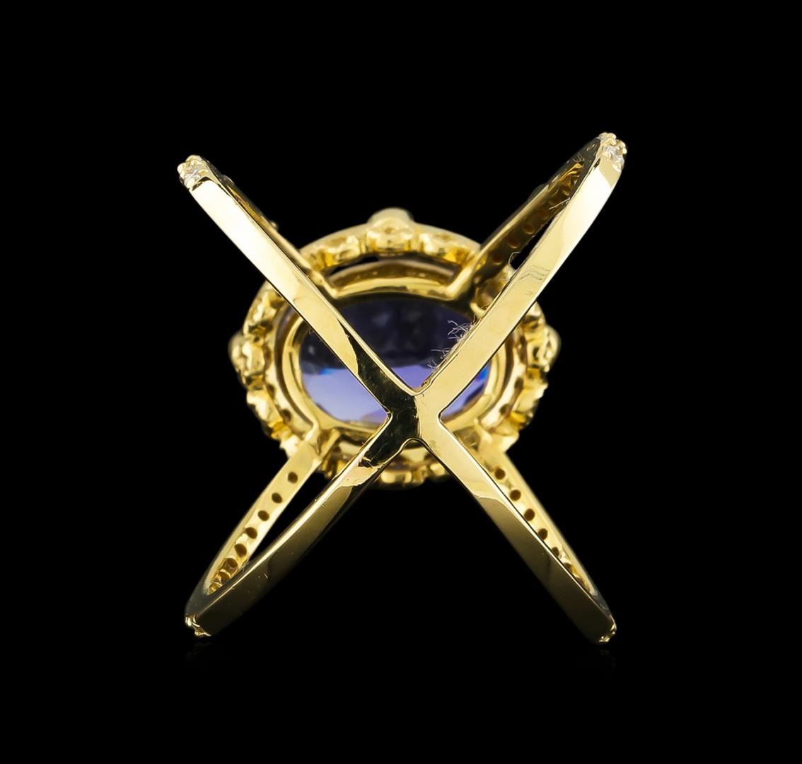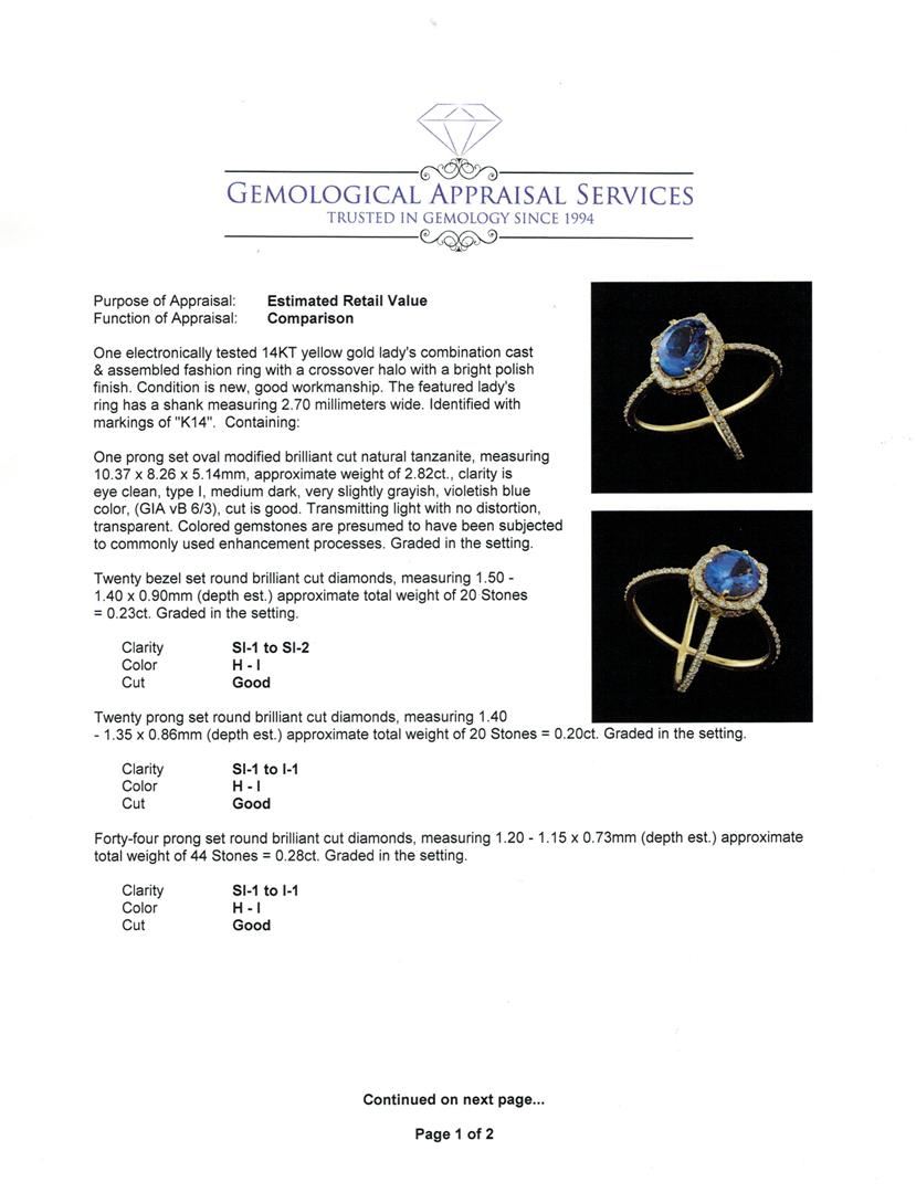 One electronically tested 14KT yellow gold lady's combination cast & assembled fashion ring with a crossover halo with a bright polish finish. The featured lady's ring has a shank measuring 2.70 millimeters wide. Identified with markings of "K14". Condition is new, good workmanship. Containing: One prong set oval modified brilliant cut natural tanzanite, measuring 10.37 x 8.26 x 5.14mm, approximate weight of 2.82ct., clarity is eye clean, type I, medium dark, very slightly grayish, violetish blue color, (GIA vB 6/3), cut is good. Transmitting light with no distortion, transparent. Colored gemstones are presumed to have been subjected to commonly used enhancement processes. Graded in the setting. Twenty bezel set round brilliant cut diamonds, measuring 1.50 - 1.40 x 0.90mm (depth est.) approximate total weight of 20 Stones = 0.23ct. Graded in the setting. Clarity: SI-1 to SI-2. Color: H - I. Cut Good Twenty prong set round brilliant cut diamonds, measuring 1.40 - 1.35 x 0.86mm (depth est.) approximate total weight of 20 Stones = 0.20ct. Graded in the setting. Clarity: SI-1 to I-1. Color: H - I. Cut Good Forty-Four prong set round brilliant cut diamonds, measuring 1.20 - 1.15 x 0.73mm (depth est.) approximate total weight of 44 Stones = 0.28ct. Graded in the setting. Clarity: SI-1 to I-1. Color: H - I. Cut Good. Total Weight of Colored Stones 2.82ct. Total Weight of Diamonds 0.71ct. Total Weight of Ring 5.00gm. GAS Appraised at $6,675.00.