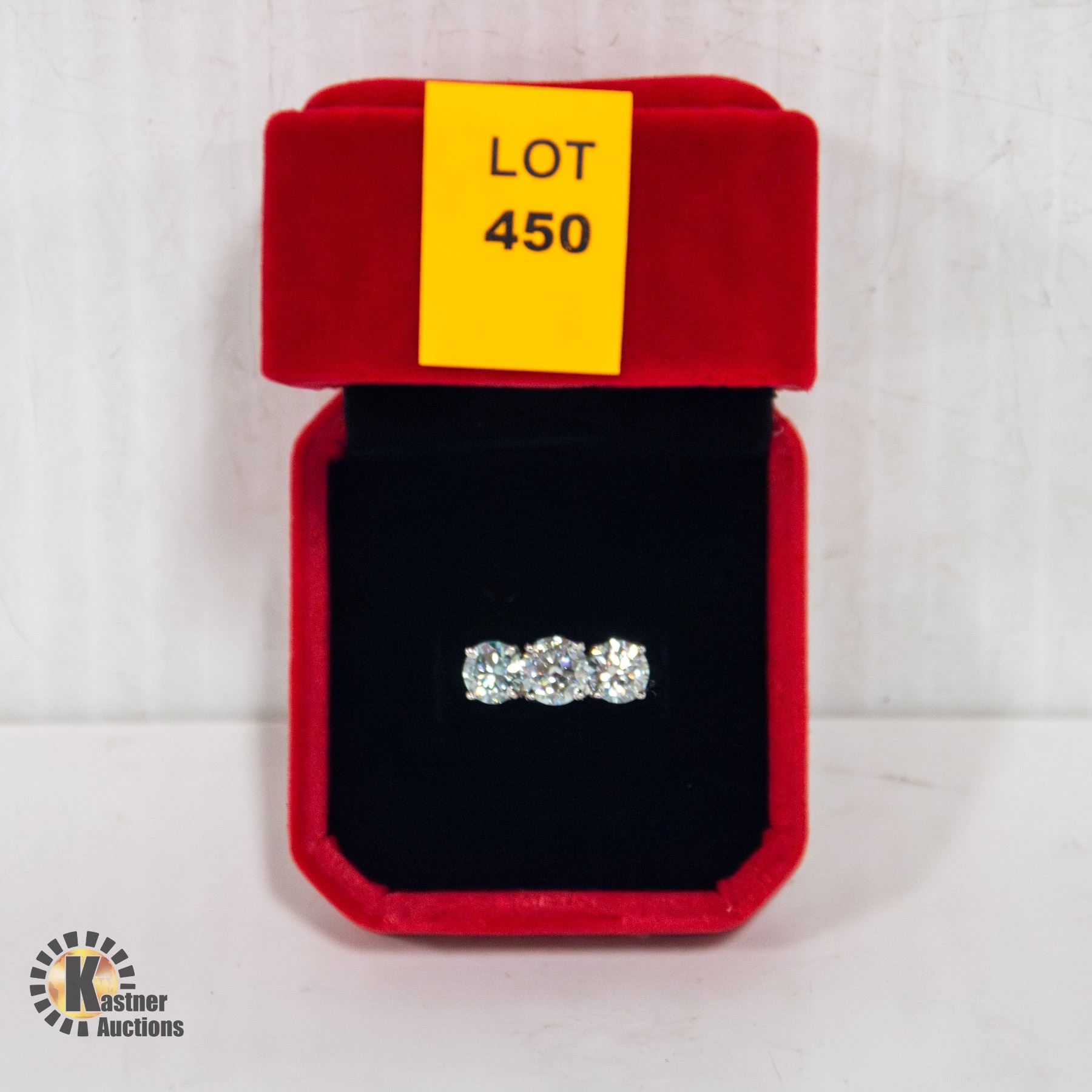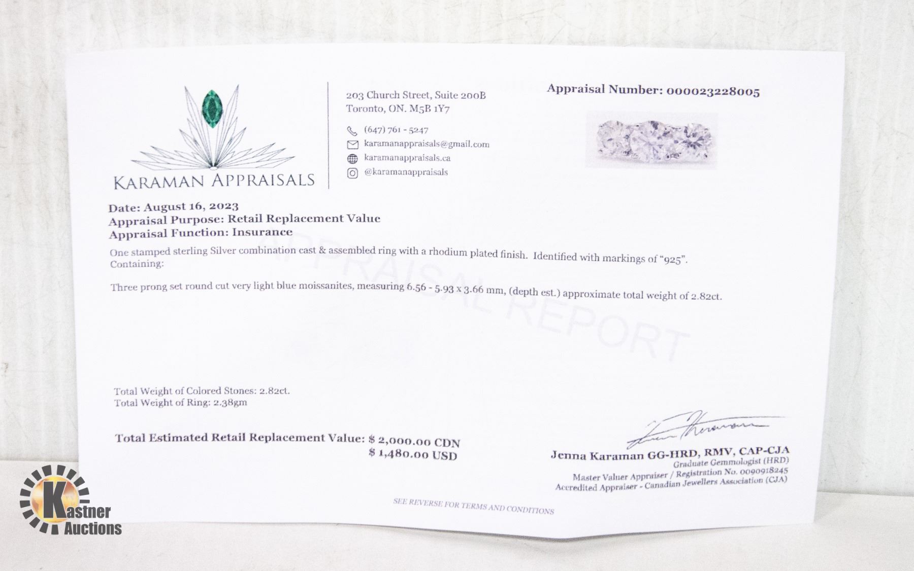 STERLING SILVER RING WITH 3 PRONG SET ROUND CUT VERY LIGHT BLUE MOISSANITES MEASURING 6.56-5.93 X 3.66MM COMES WITH APPRAISAL FROM KARAMAN APPRAISALS (000023228005) WITH APPRAISED VALUE OF $2000.00 **ALL ITEMS MUST BE REMOVED BY 5PM SATURDAY, SEPTEMBER 2ND 2023. ALL REMAINING ITEMS WILL BE SUBJECT TO A $6.00 PER DAY STORAGE CHARGE. ANY ITEMS REMAINING AFTER MONDAY, SEPTEMBER 18TH, 2023 WILL BE CONSIDERED FORFEITED. NO REFUNDS WILL BE ISSUED FOR FORFEITED ITEMS. TO SCHEDULE A PICK UP APPOINTMENT CLICK HERE