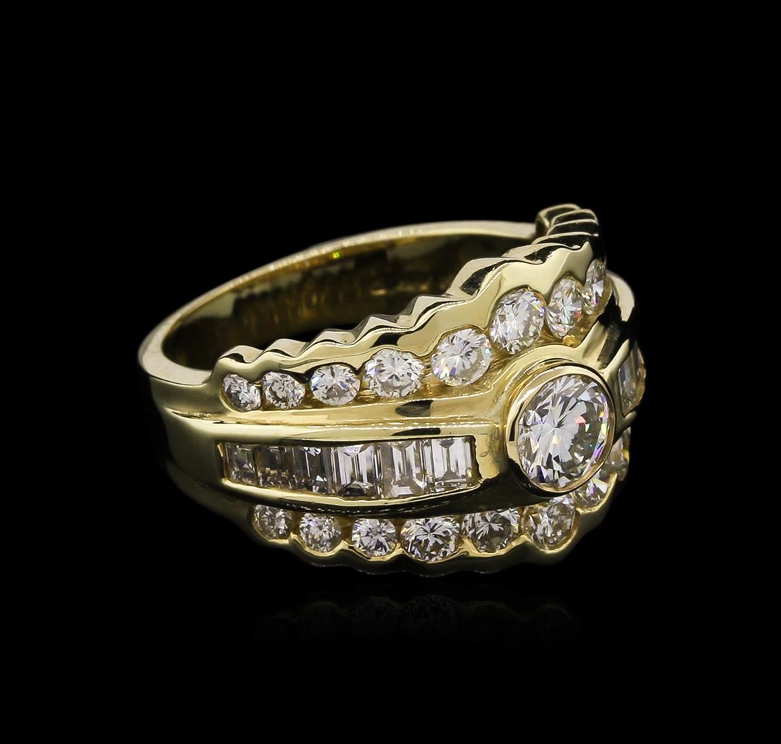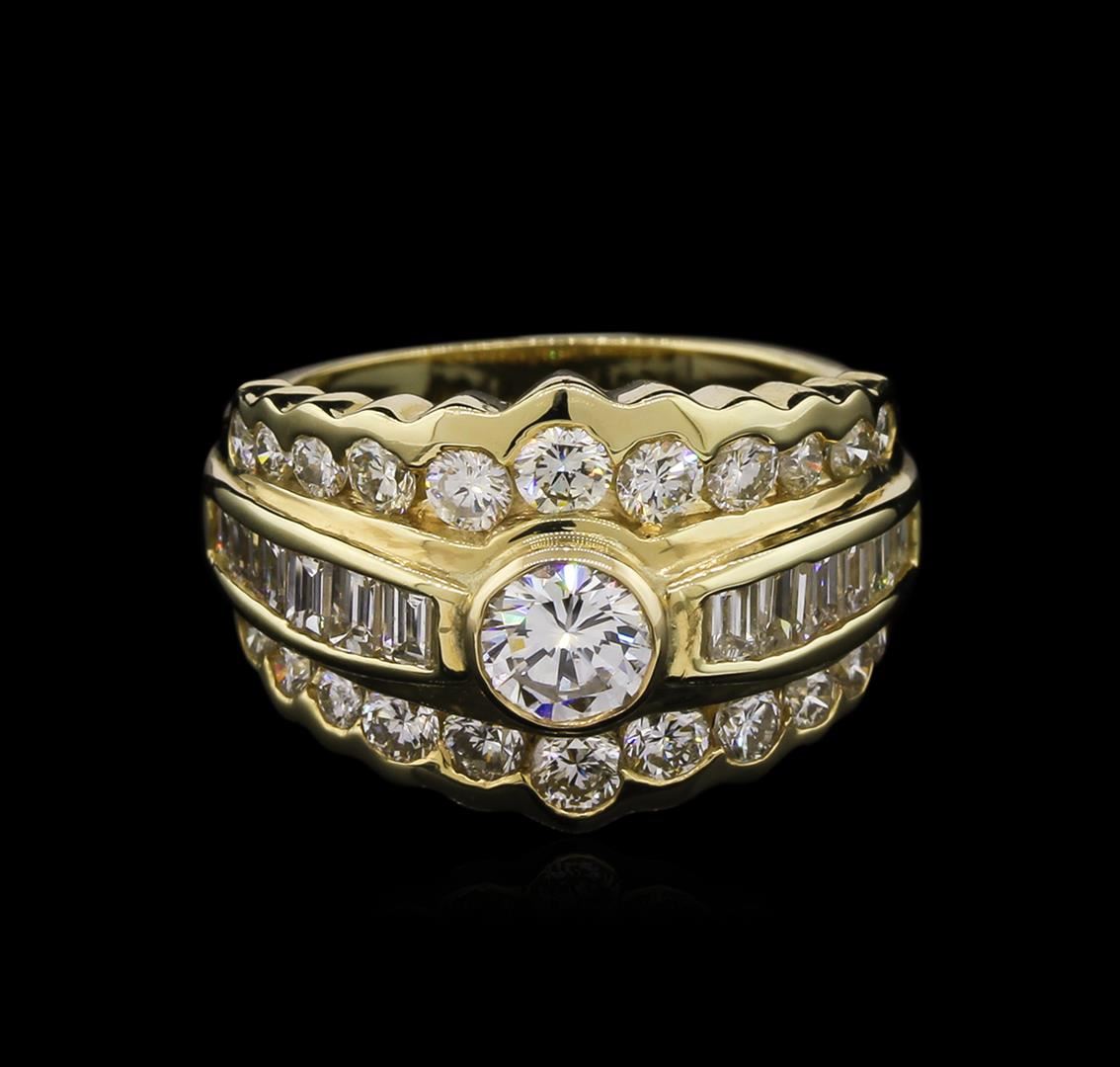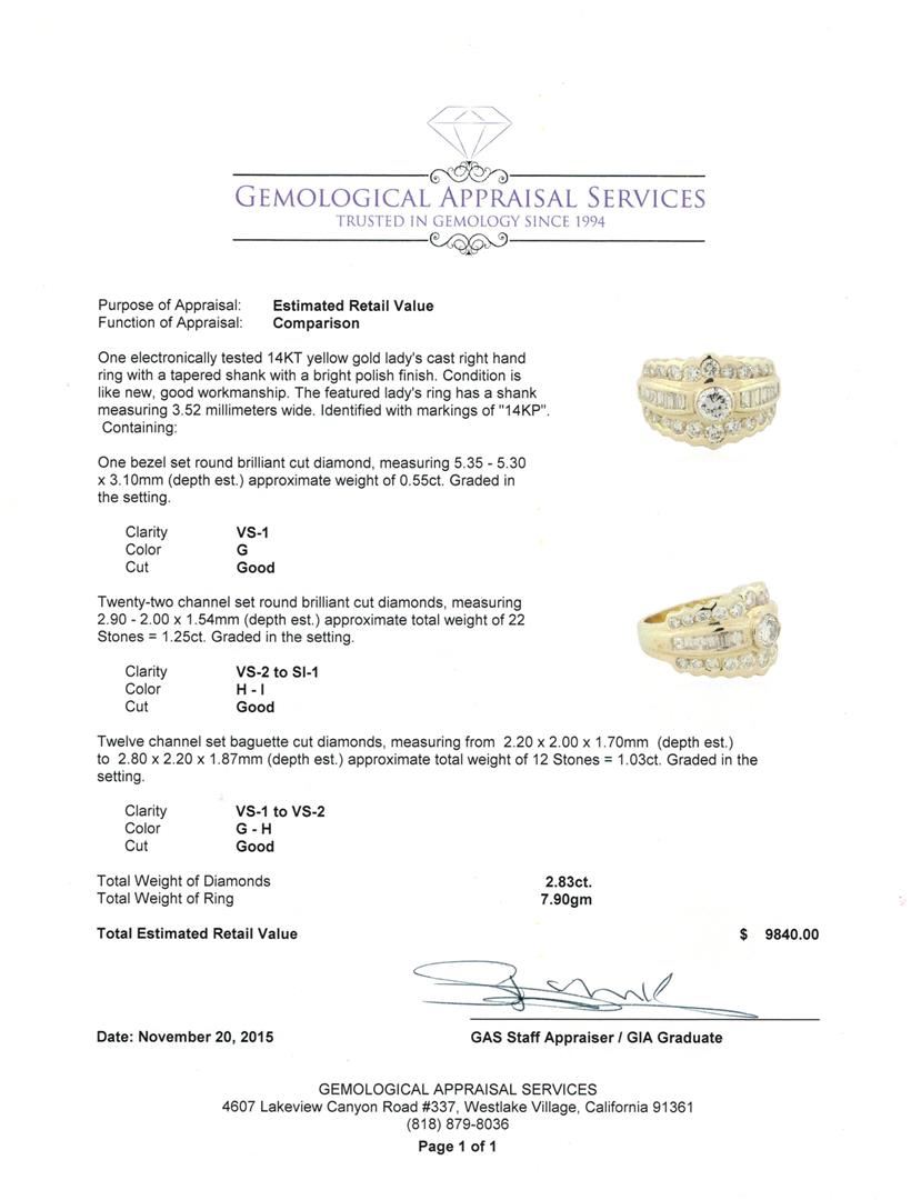 One electronically tested 14KT yellow gold lady's cast right hand ring with a tapered shank with a bright polish finish. The featured lady's ring has a shank measuring 3.52 millimeters wide. Identified with markings of "14KP". Condition is like new, good workmanship. Containing: One bezel set round brilliant cut diamond, measuring 5.35 - 5.30 x 3.10mm (depth est.) approximate weight of 0.55ct. Graded in the setting. Clarity: VS-1. Color: Good Twenty-Two channel set round brilliant cut diamonds, measuring 2.90 - 2.00 x 1.54mm (depth est.) approximate total weight of 22 Stones = 1.25ct. Graded in the setting. Clarity: VS-2 to SI-1. Color: H - I. Cut Good Twelve channel set baguette cut diamonds, measuring from 2.20 x 2.00 x 1.70mm (depth est.) to 2.80 x 2.20 x 1.87mm (depth est.) approximate total weight of 12 Stones = 1.03ct. Graded in the setting. Clarity: VS-1 to VS-2. Color: G - Good. Total Weight of Diamonds 2.83ct. Total Weight of Ring 7.90gm. GAS Appraised at $9,840.00.