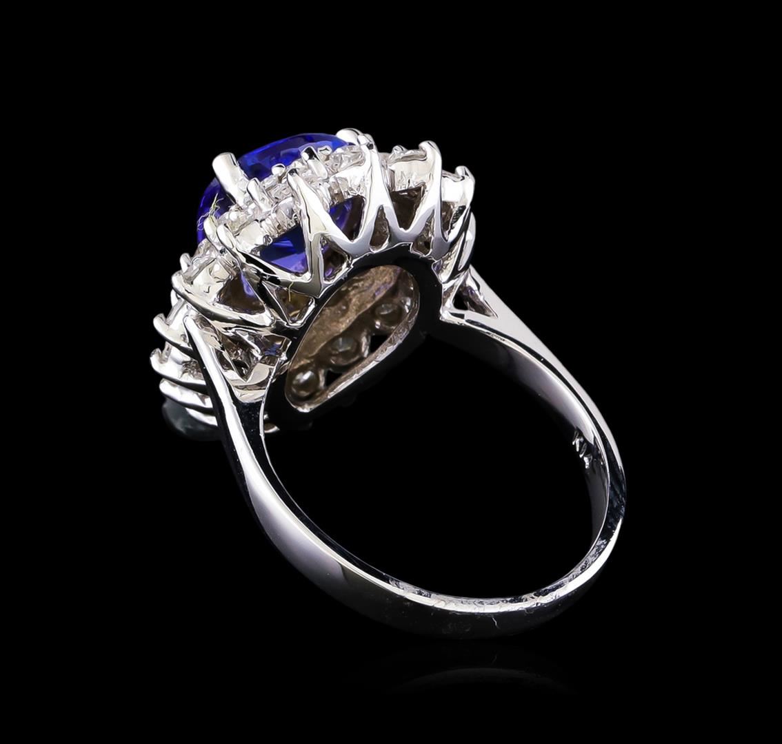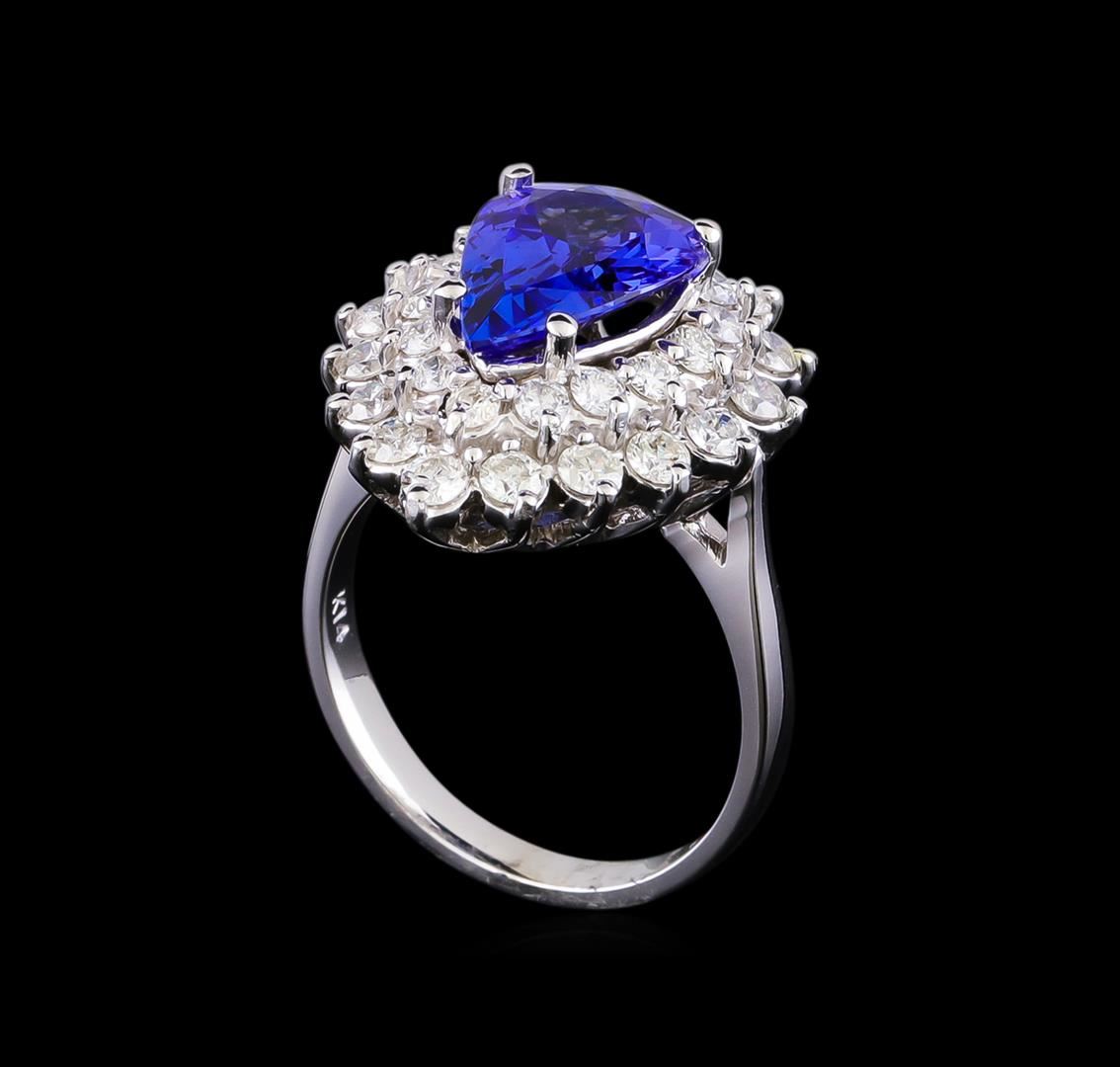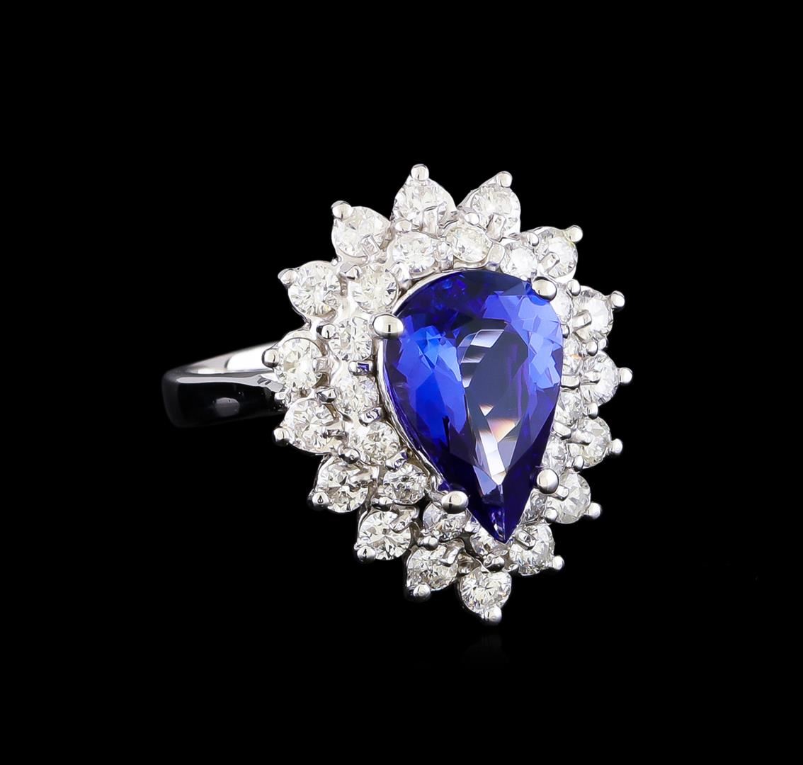 One electronically tested 14KT white gold lady's cast fashion ring with a double basket halo with a bright polish finish. The featured lady's ring has a shank measuring 2.54 millimeters in width. Identified with markings of "K14". Condition is new, good workmanship. Containing: One prong set pear modified brilliant cut natural tanzanite, measuring 12.52 x 8.41 x 4.70mm, (depth est.) approximate weight of 2.83ct., clarity is eye clean, medium dark, strong, bluish violet color, (GIA bV 6/5), cut is very good. Transmitting light with no distortion, transparent. Colored gemstones are presumed to have been subjected to commonly used enhancement processes. Graded in the setting. Fifteen prong set round brilliant cut diamonds, measuring 2.10 - 2.00 x 1.23mm (depth est.) approximate total weight of 15 Stones = 0.48ct. Graded in the setting. Clarity: SI-1 to I-1. Color: G - Good Sixteen prong set round brilliant cut diamonds, measuring 2.40 - 2.30 x 1.43mm (depth est.) approximate total weight of 16 Stones = 0.78ct. Graded in the setting. Clarity: SI-1 to SI-2. Color: G - Good. Total Weight of Colored Stones 2.83ct. Total Weight of Diamonds 1.26ct. Total Weight of Ring 7.30gm GAS Appraised at $8,655.00.