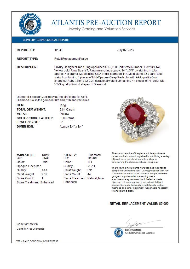 2.84 CTW Ruby & Diamond Ring 14K Yellow Gold ---- Luxury Designer Brand Ring Appraised Retail Price at $5,050 ---- SKU Number US12949 14k Yellow gold Ring Size is 7, Ring measuring approx. 3/4" x 3/4" , weighing in total approx. 4.5 grams. Made in the USA and is stamped 14k, Main stone 2.53 carat total weight containing 1 pieces of Mid-Opaque-Deep Red color with AAA quality Oval shape cut Ruby , Stone #2 0.31 carat total weight containing 44 pieces of H-I color with VS/SI quality Round shape cut
