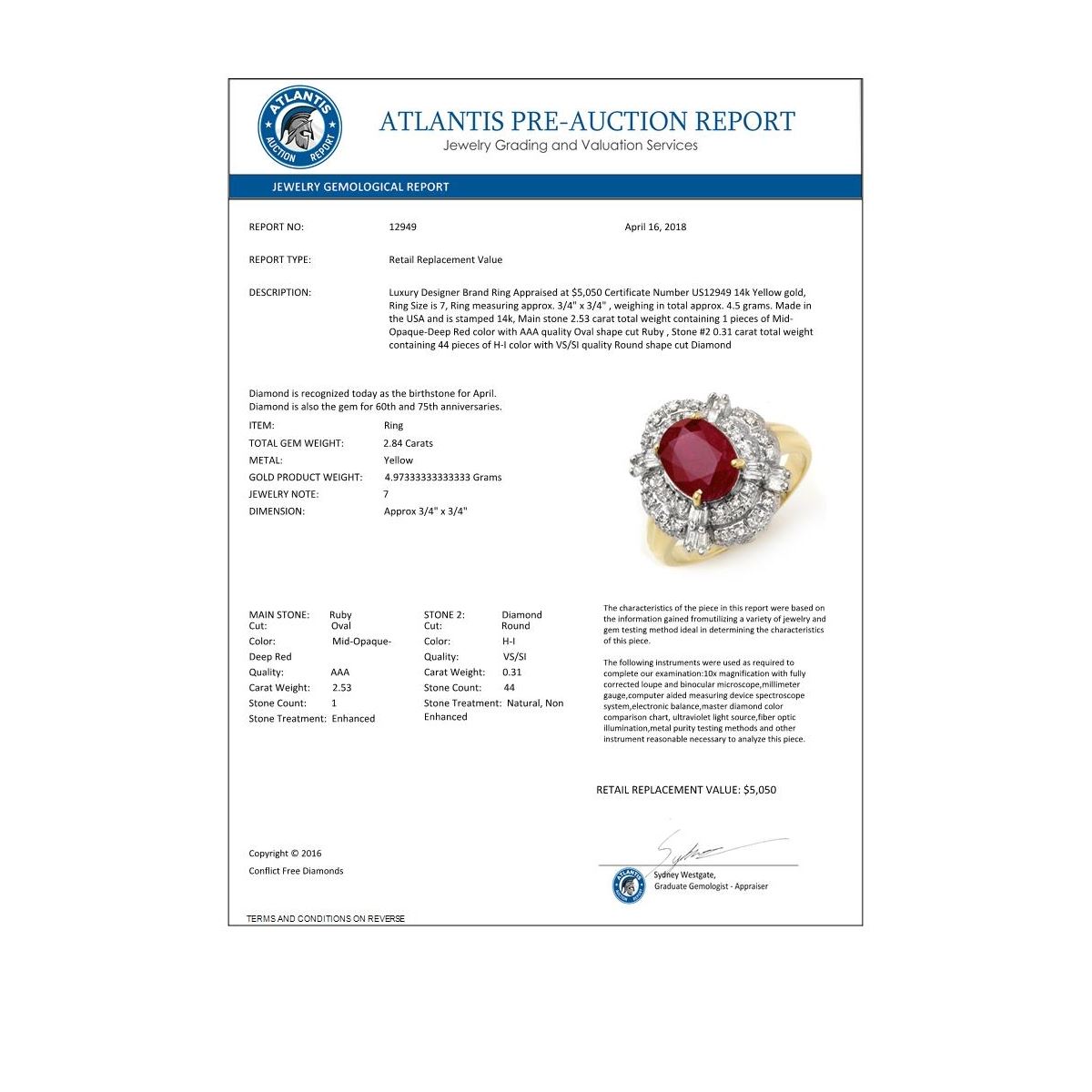 REF-70N9Y -12949 ---- 2.84 CTW Ruby & Diamond Ring 14K Yellow Gold ---- Luxury Designer Brand Ring Appraised at $5,050 Certificate Number US12949 14k Yellow gold, Ring Size is 7, Ring measuring approx. 3/4" x 3/4" , weighing in total approx. 4.5 grams. Made in the USA and is stamped 14k, Main stone 2.53 carat total weight containing 1 pieces of Mid-Opaque-Deep Red color with AAA quality Oval shape cut Ruby , Stone #2 0.31 carat total weight containing 44 pieces of H-I color with VS/SI quality Round shape cut Diamond