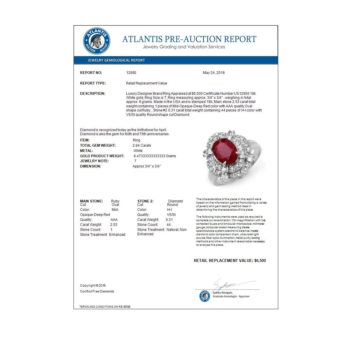 REF-90M9H -12950 ---- 2.84 CTW Ruby & Diamond Ring 18K White Gold ---- Luxury Designer Brand Ring Appraised at $6,500 Certificate Number US12950 18k White gold, Ring Size is 7, Ring measuring approx. 3/4" x 3/4" , weighing in total approx. 6 grams. Made in the USA and is stamped 18k, Main stone 2.53 carat total weight containing 1 pieces of Mid-Opaque-Deep Red color with AAA quality Oval shape cut Ruby , Stone #2 0.31 carat total weight containing 44 pieces of H-I color with VS/SI quality Round shape cut Diamond