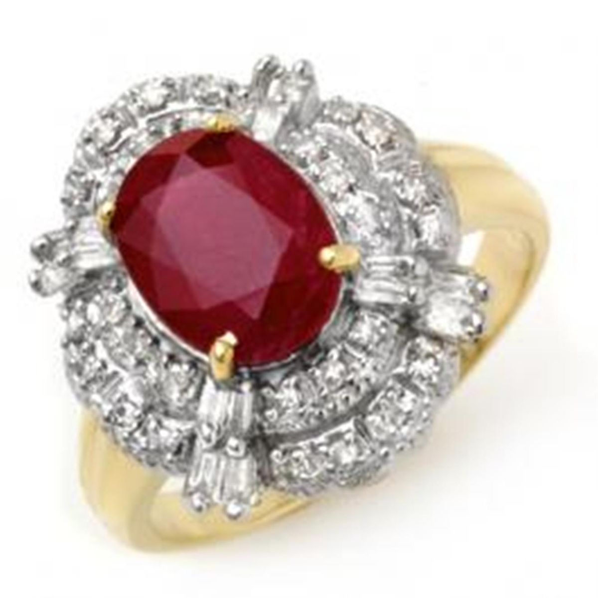Diamond: 28 RD & BGT cut @ 0.31 ctw Clarity: SI-I Color: H-K Gemstone: Natural Ruby Gemstone color: RedGemstone quality: Good-to-Very Good Gemstone Cut & Weight: 1 Oval cut @ 2.53 ctw Metal Purity & Color : 14K Gold-Yellow Gold weight: 4.50 grams Ring size (US): 7Dimension: Approx. 3/4" x 3/4"