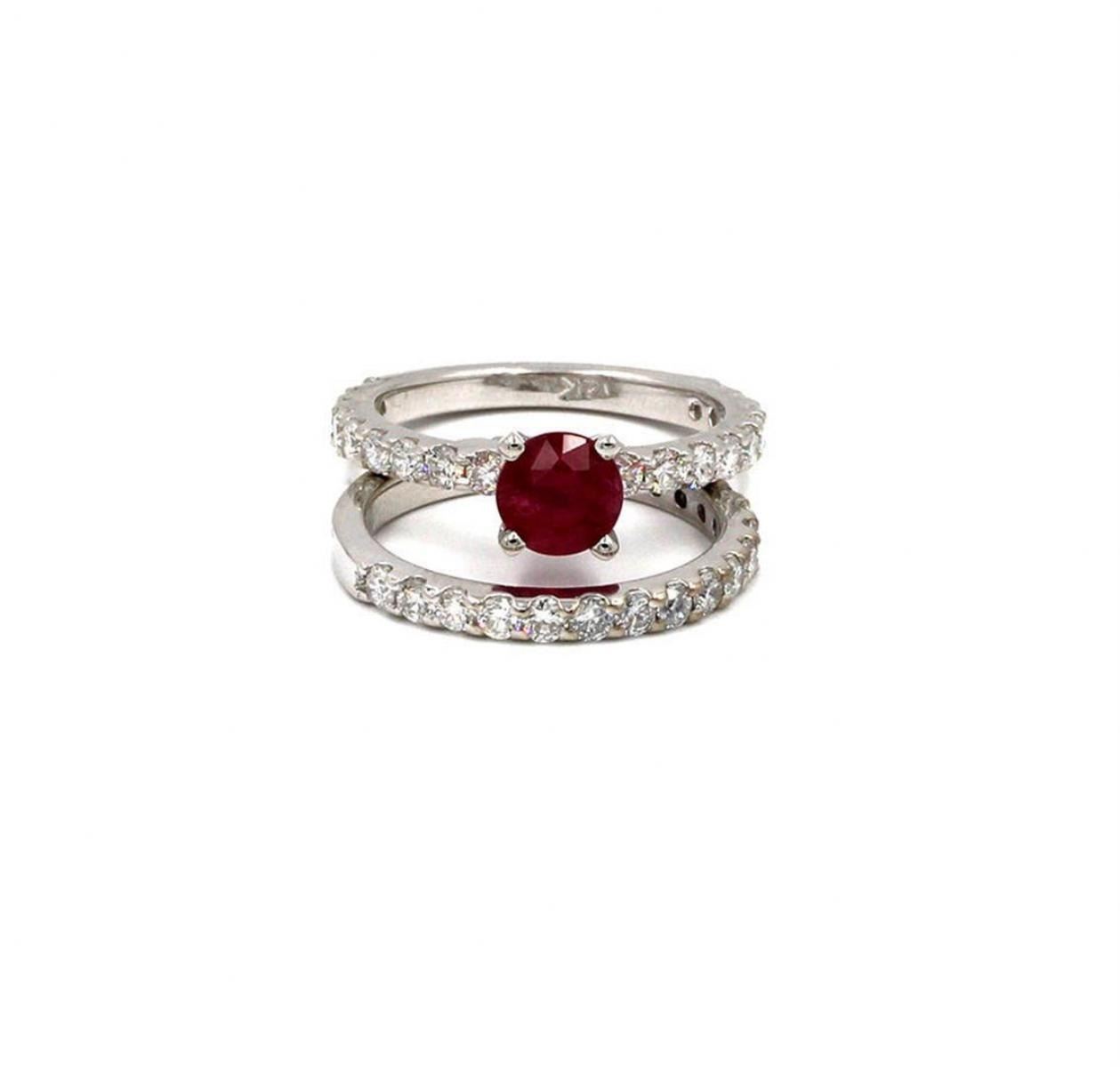 One lady's engagement/wedding set featuring: 14KT white gold weighing 5.30 grams containing one ruby weighing 1.35ct and 38 diamonds weighing 1.49ctw. The ruby is round brilliant cut with a fine, deep red color and very good cut. The diamonds are round brilliant cut and are natural, unenhanced stones that have SI-1 clarity, G-H color and very good cut. Ring size is 6 but is resizable.