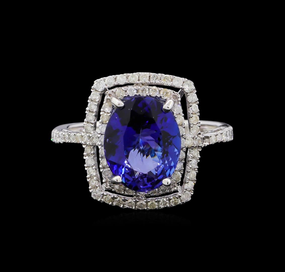 Fourteen karat (14K) white gold tanzanite and diamond ring. An oval cut tanzanite zoisite gemstone is prong mounted in the center of the ring. Round brilliant cut diamonds accent the ring around and on both sides of the center gemstone. The ring is cast stamped "14K" and has a gross weight of 2.8 grams. Diamond(s): Shape: Round brilliant cut. Weight: 0.53 carat. Average clarity: I1. Average color: H-J. Symmetry: Very good. Polish: Very good. Gemstone(s): Gemstone: Tanzanite Zoisit. Nature: Natural. Shape: Oval, faceted. Quantity: 1, mounted. Weight: 2.84 carat. Dimensions: Length-10.80 mm. ; Width- 8.75 mm. Bulge: Visible. Clarity: VS, type 1. color: Purplish blue (4/5). Symmetry: Very good. Color intensity: Medium. Transparency: Translucent. Tone: Dark. Enhancements: Coated. Metal(s): Metal: Gold, stamped. Purity: 14K. Color: White. Condition: Excellent. Finish: High polish. GGA Appraised at $5,835.00.
