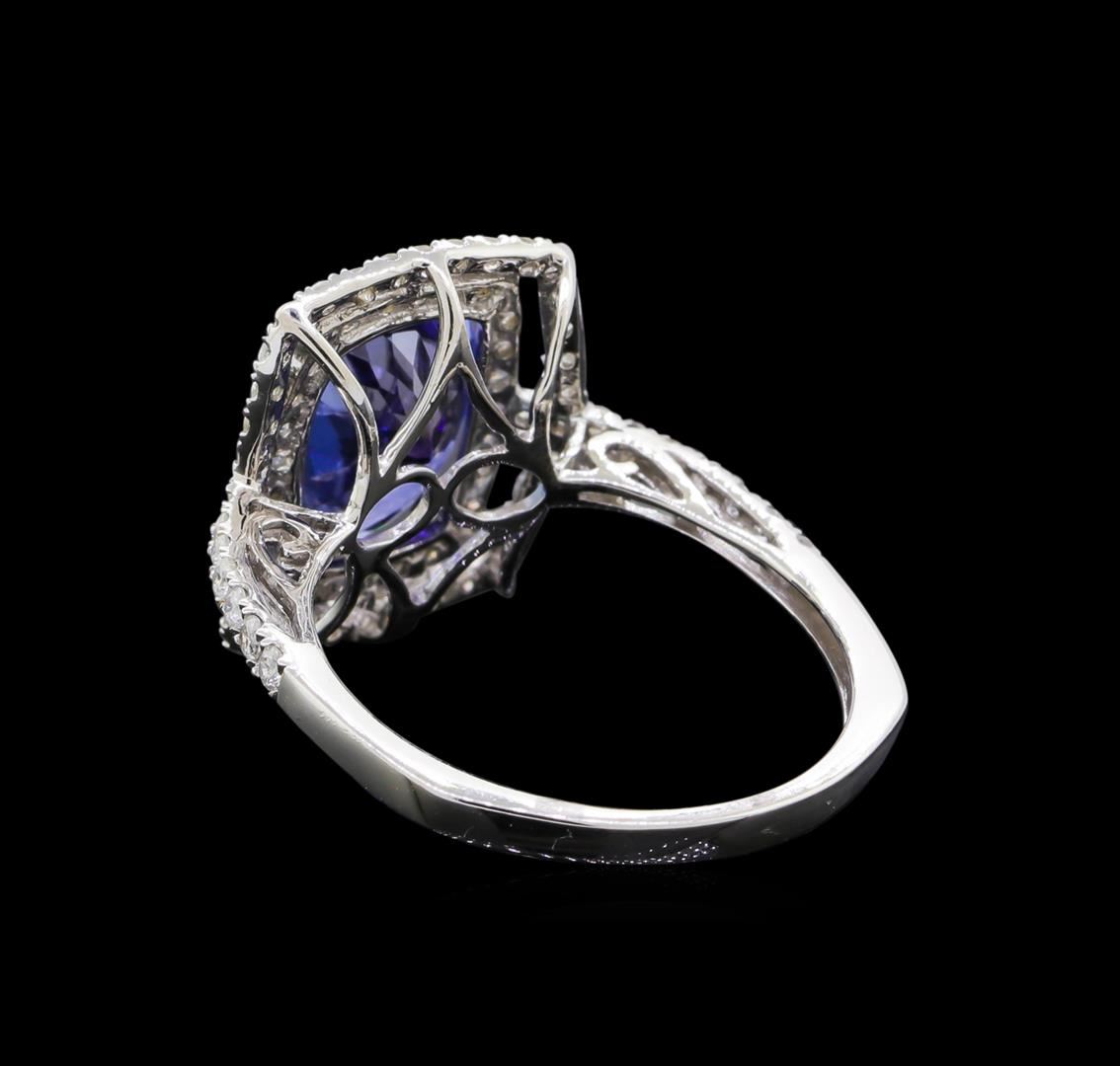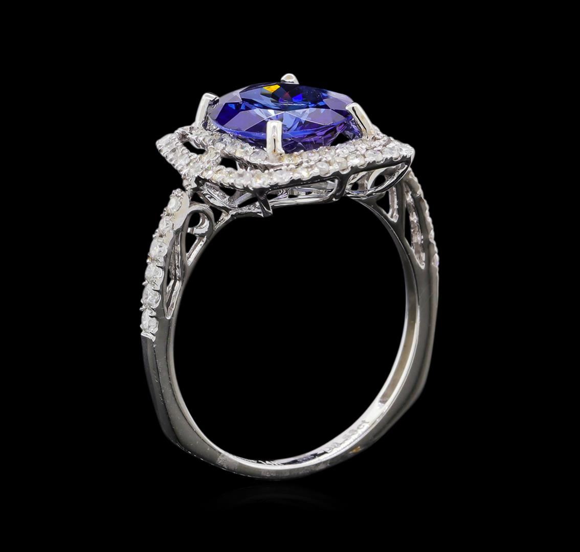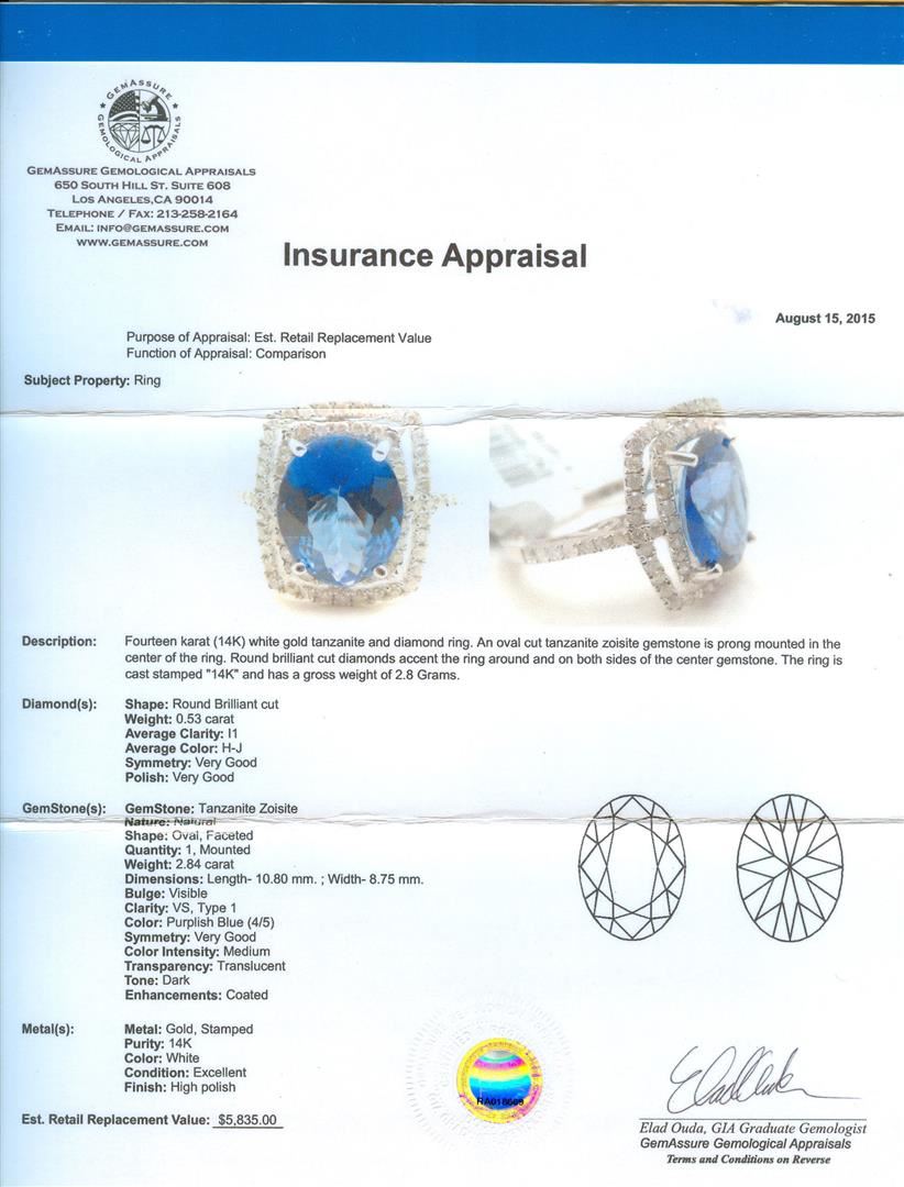 Fourteen karat (14K) white gold tanzanite and diamond ring. An oval cut tanzanite zoisite gemstone is prong mounted in the center of the ring. Round brilliant cut diamonds accent the ring around and on both sides of the center gemstone. The ring is cast stamped "14K" and has a gross weight of 2.8 grams. Diamond(s): Shape: Round brilliant cut. Weight: 0.53 carat. Average clarity: I1. Average color: H-J. Symmetry: Very good. Polish: Very good. Gemstone(s): Gemstone: Tanzanite Zoisit. Nature: Natural. Shape: Oval, faceted. Quantity: 1, mounted. Weight: 2.84 carat. Dimensions: Length-10.80 mm. ; Width- 8.75 mm. Bulge: Visible. Clarity: VS, type 1. color: Purplish blue (4/5). Symmetry: Very good. Color intensity: Medium. Transparency: Translucent. Tone: Dark. Enhancements: Coated. Metal(s): Metal: Gold, stamped. Purity: 14K. Color: White. Condition: Excellent. Finish: High polish. GGA Appraised at $5,835.00.