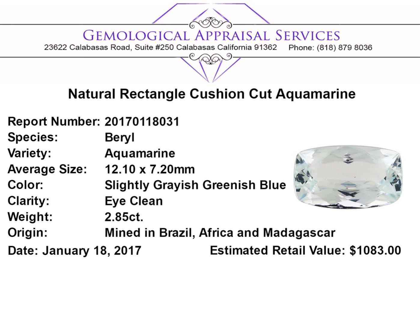 One natural rectangle cushion cut aquamarine with an exact weight of 2.85ct., clarity is eye clean, slightly grayish greenish blue. Gemological Appraisals Services estimates the retail value at $1083 GAS Appraised.