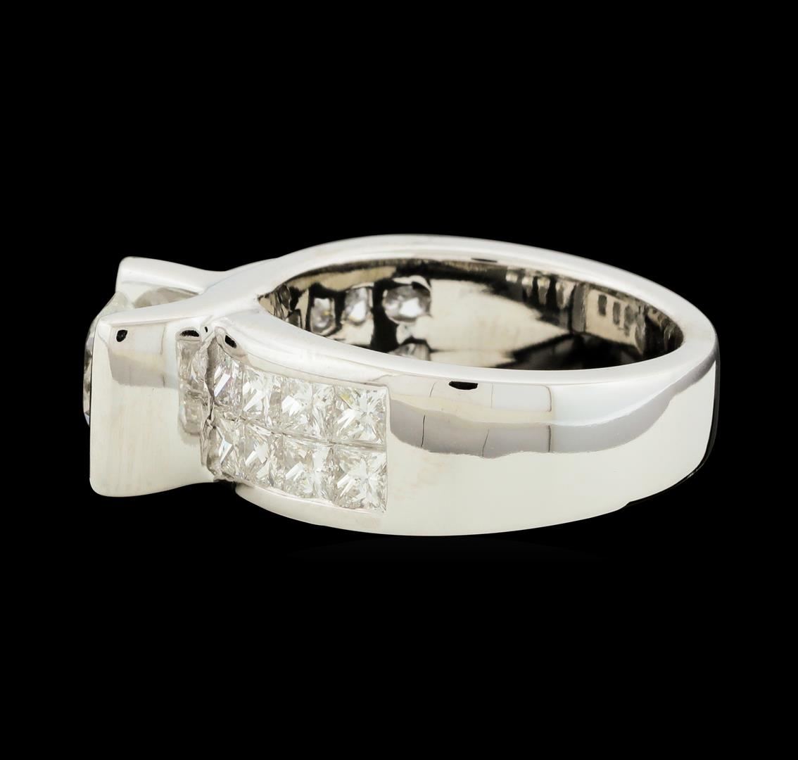 One electronically tested 14KT white gold lady's cast wedding ring with a bright polish finish. The featured lady's ring has a wide band motif with a scalloped setting for the center stone and a shank measuring 4.82 millimeters wide. Identified with markings of '14K'. Condition is new, good workmanship. Containing: One channel set round brilliant cut diamond, measuring 6.77 - 6.73 x 4.19mm (depth est.) approximate weight of 1.20ct. Graded in the setting. Clarity I-1. Color: H - I Cut Good Sixteen invisible set princess cut diamonds, measuring 2.70 x 2.50 x 1.87mm (depth est.) approximate total weight of 16 Stones = 1.65ct. Graded in the setting. Clarity VS-2 to SI-1. Color: H - I Cut Very Good. Total Weight of Diamonds 2.85ct.. Total Weight of Ring 10.20gm. GAS Appraised at $11,925.00.