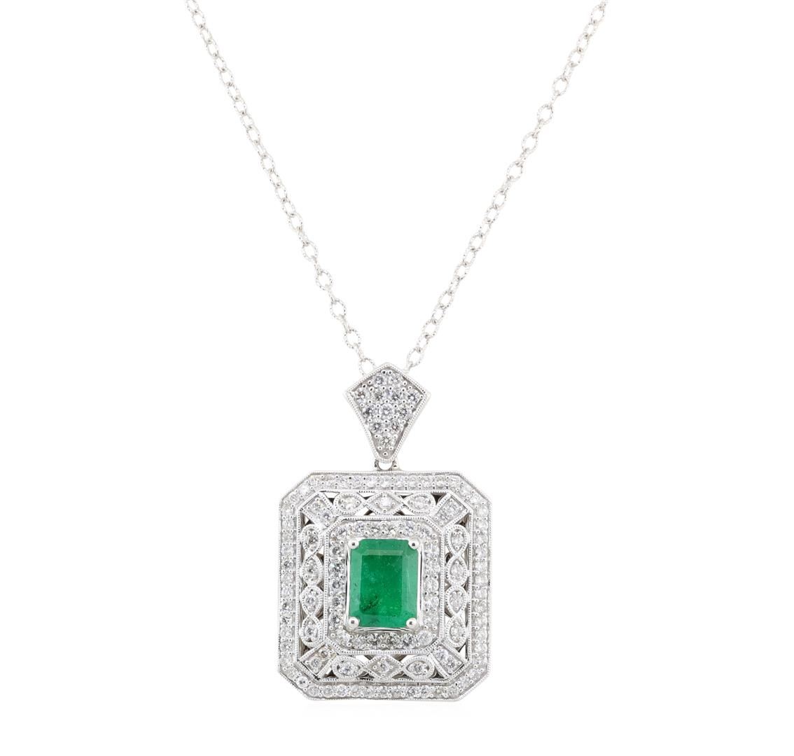 One electronically tested 18KT white gold cast & assembled emerald & diamond pendant with chain. The milgrain detailed hexagonal shape pendant features an emerald set within a multi-tiered diamond bezel, completed by an twenty inch length 18KT white gold designer style chain, with a lobster claw clasp. Identified with markings of "18K". Condition is new, good workmanship. Containing: One prong set rectangular step cut natural emerald, measuring 9.77 x 7.55 x 4.91mm, approximate weight of 2.85ct., clarity is heavily included, type III, medium dark, very slightly grayish, very slightly bluish green color, (GIA vslbG 6/3), cut is good. Transmitting light somewhat diffusely, transparent to translucent. Naturally occurring internal & external characteristics are present. Indications of oil residue. Graded in the setting. One Hundred Ten prong set round brilliant cut diamonds approximate total weight of 110 Stones = 1.69ct. Graded in the setting. Clarity SI-1 to I-1 Color G - I Total Weight of Colored Stones 2.85 ct. Total Weight of Diamonds 1.69 ct. Total Weight of Pendant With Chain 12.20 gm Estimated Retail Value $ 14,000.00 US