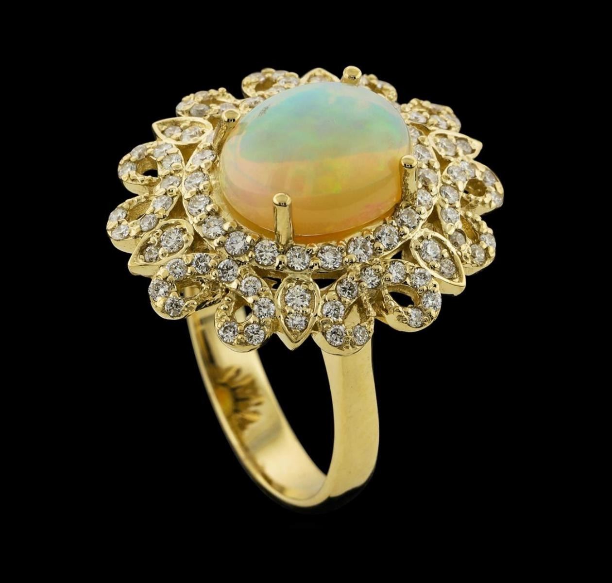 One electronically tested 14KT yellow gold lady's cast fashion ring with a scalloped double basket halo with a bright polish finish. The featured lady's ring has a shank measuring 3.55 millimeters wide. Identified with markings of 'K14'. Condition is new, good workmanship. Containing: One crystal opal that is cut in a oval shaped cabochon and is prong set, measuring 11.15 mm long x 9.20 mm wide, and 5.75 mm thick and the approximate weight is 2.85 carats. The opal has a exceptionally bright, multicolor play of color (fire) in a rolling flashfire pattern; a high dome; a good cut; no inclusions; slight variation in base in its brightness and pattern; and is not directional. Graded in the setting. Twenty-Eight prong set round brilliant cut diamonds, measuring 1.55 - 1.45 x 0.90mm (depth est.) approximate total weight of 28 Stones = 0.34ct. Graded in the setting. Clarity SI-1 to SI-2. Color: G - H Cut Good Sixty prong set round brilliant cut diamonds, measuring 1.30 - 1.10 x 0.74mm (depth est.) approximate total weight of 60 Stones = 0.42ct. Graded in the setting. Clarity SI-1 to SI-3. Color: G - H Cut Good. Total Weight of Diamonds 0.76ct.. Total Weight of Opals 2.85ct.. Total Weight of Ring 7.70gm. GAS Appraised.