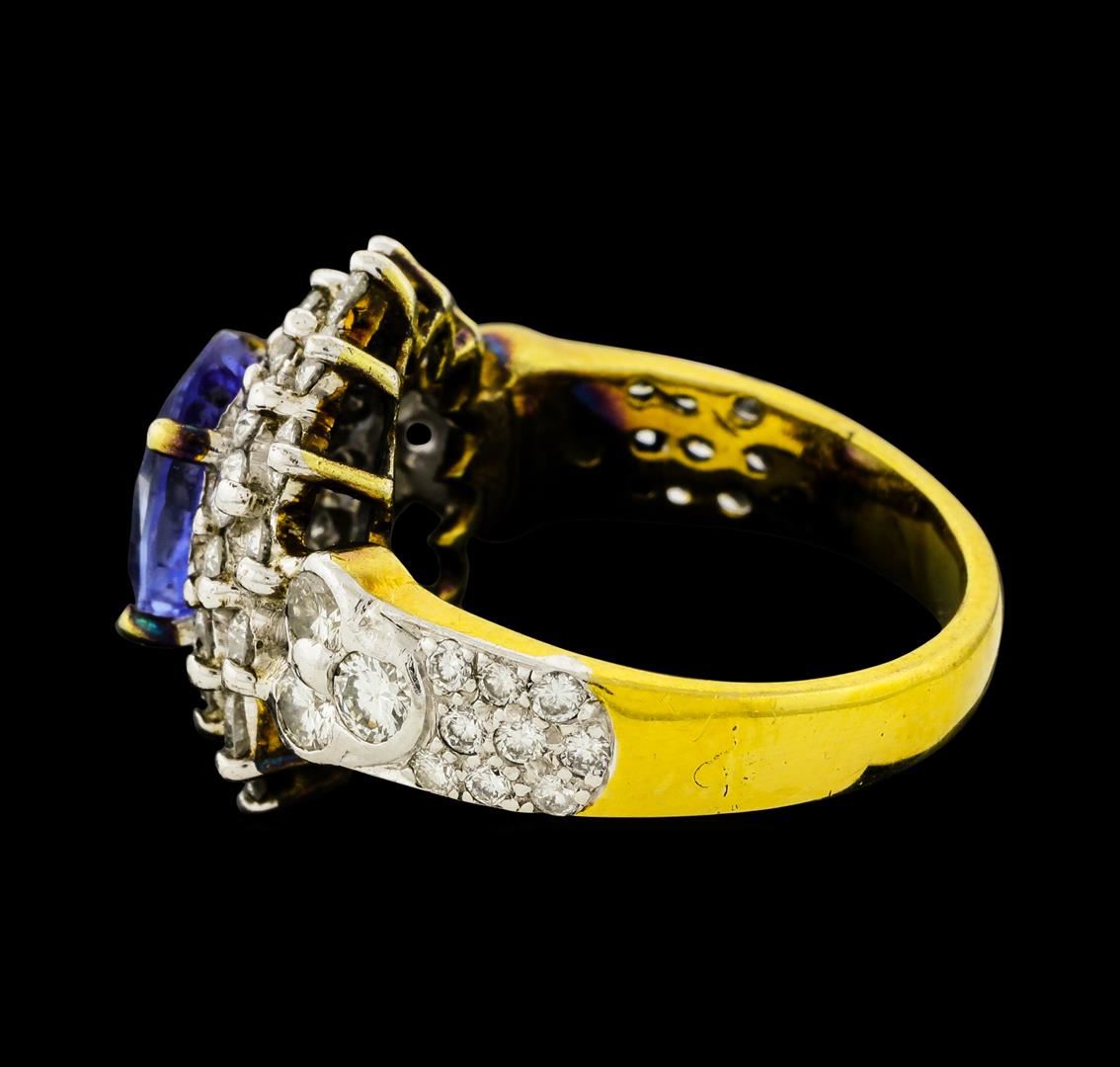 One electronically tested 9KT yellow with rhodium plating gold lady's combination cast & assembled fashion ring with a double basket halo with a bright polish finish. The featured lady's ring has a shank measuring 3.50 millimeters wide. Condition is used, good workmanship. Containing: One prong set oval modified mixed cut natural blue sapphire, measuring 9.48 x 7.61 x 4.71mm, (depth est.) approximate weight of 2.85ct., clarity is slightly included, medium light, very slightly grayish, blue color, (GIA B 4/3), cut is good. Transmitting light with a minimum of distortion, transparent. Colored gemstones are presumed to have been subjected to commonly used enhancement processes. Graded in the setting. Six bezel set round brilliant cut diamonds, measuring 2.80 - 2.70 x 1.71mm (depth est.) approximate total weight of 6 Stones = 0.48ct. Graded in the setting. Clarity VS-2 to SI-1. Color: H - I Cut Good Twenty-Eight prong set round brilliant cut diamonds, measuring 2.40 - 2.20 x 1.43mm (depth est.) approximate total weight of 28 Stones = 1.30ct. Graded in the setting. Clarity VS-2 to SI-1. Color: H - I Cut Very Good Eighteen prong set round brilliant cut diamonds, measuring 1.70 - 1.60 x 1.02mm (depth est.) approximate total weight of 18 Stones = 0.30ct. Graded in the setting. Clarity VS-2 to SI-1. Color: H - I Cut Good. Total Weight of Colored Stones 2.85ct.. Total Weight of Diamonds 2.08ct.. Total Weight of Ring 7.40gm. GAS Appraised at $8,735.00.
