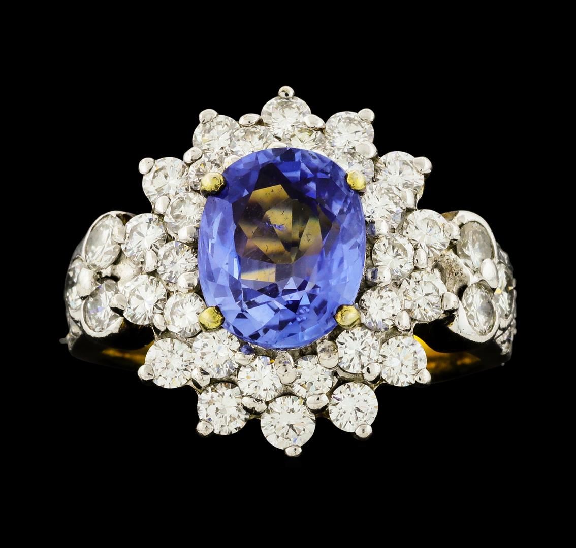 One electronically tested 9KT yellow with rhodium plating gold lady's combination cast & assembled fashion ring with a double basket halo with a bright polish finish. The featured lady's ring has a shank measuring 3.50 millimeters wide. Condition is used, good workmanship. Containing: One prong set oval modified mixed cut natural blue sapphire, measuring 9.48 x 7.61 x 4.71mm, (depth est.) approximate weight of 2.85ct., clarity is slightly included, medium light, very slightly grayish, blue color, (GIA B 4/3), cut is good. Transmitting light with a minimum of distortion, transparent. Colored gemstones are presumed to have been subjected to commonly used enhancement processes. Graded in the setting. Six bezel set round brilliant cut diamonds, measuring 2.80 - 2.70 x 1.71mm (depth est.) approximate total weight of 6 Stones = 0.48ct. Graded in the setting. Clarity VS-2 to SI-1. Color: H - I Cut Good Twenty-Eight prong set round brilliant cut diamonds, measuring 2.40 - 2.20 x 1.43mm (depth est.) approximate total weight of 28 Stones = 1.30ct. Graded in the setting. Clarity VS-2 to SI-1. Color: H - I Cut Very Good Eighteen prong set round brilliant cut diamonds, measuring 1.70 - 1.60 x 1.02mm (depth est.) approximate total weight of 18 Stones = 0.30ct. Graded in the setting. Clarity VS-2 to SI-1. Color: H - I Cut Good. Total Weight of Colored Stones 2.85ct.. Total Weight of Diamonds 2.08ct.. Total Weight of Ring 7.40gm. GAS Appraised at $8,735.00.
