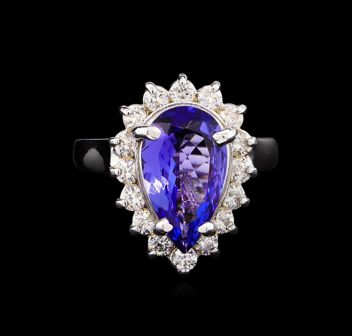 One electronically tested 14KT white gold lady's cast fashion ring with a basket halo with a bright polish finish. The featured lady's ring has a shank measuring 2.17 millimeters wide. Identified with markings of "14K". Condition is new, good workmanship. Containing: One prong set pear modified brilliant cut natural tanzanite, measuring 14.02 x 8.23 x 3.87mm, approximate weight of 2.85ct., clarity is eye clean, type I, medium dark, moderately strong, violetish blue color, (GIA vB 6/4), cut is very good. Transmitting light with no distortion, transparent. Colored gemstones are presumed to have been subjected to commonly used enhancement processes. Graded in the setting. Sixteen prong set round brilliant cut diamonds, measuring 2.40 - 2.30 x 1.41mm (depth est.) approximate total weight of 16 Stones = 0.75ct. Graded in the setting. Clarity: SI-1 to SI-2. Color: H - I. Cut Very Good. Total Weight of Colored Stones 2.85ct. Total Weight of Diamonds 0.75ct. Total Weight of Ring 6.30gm. GAS Appraised at $7,230.00.