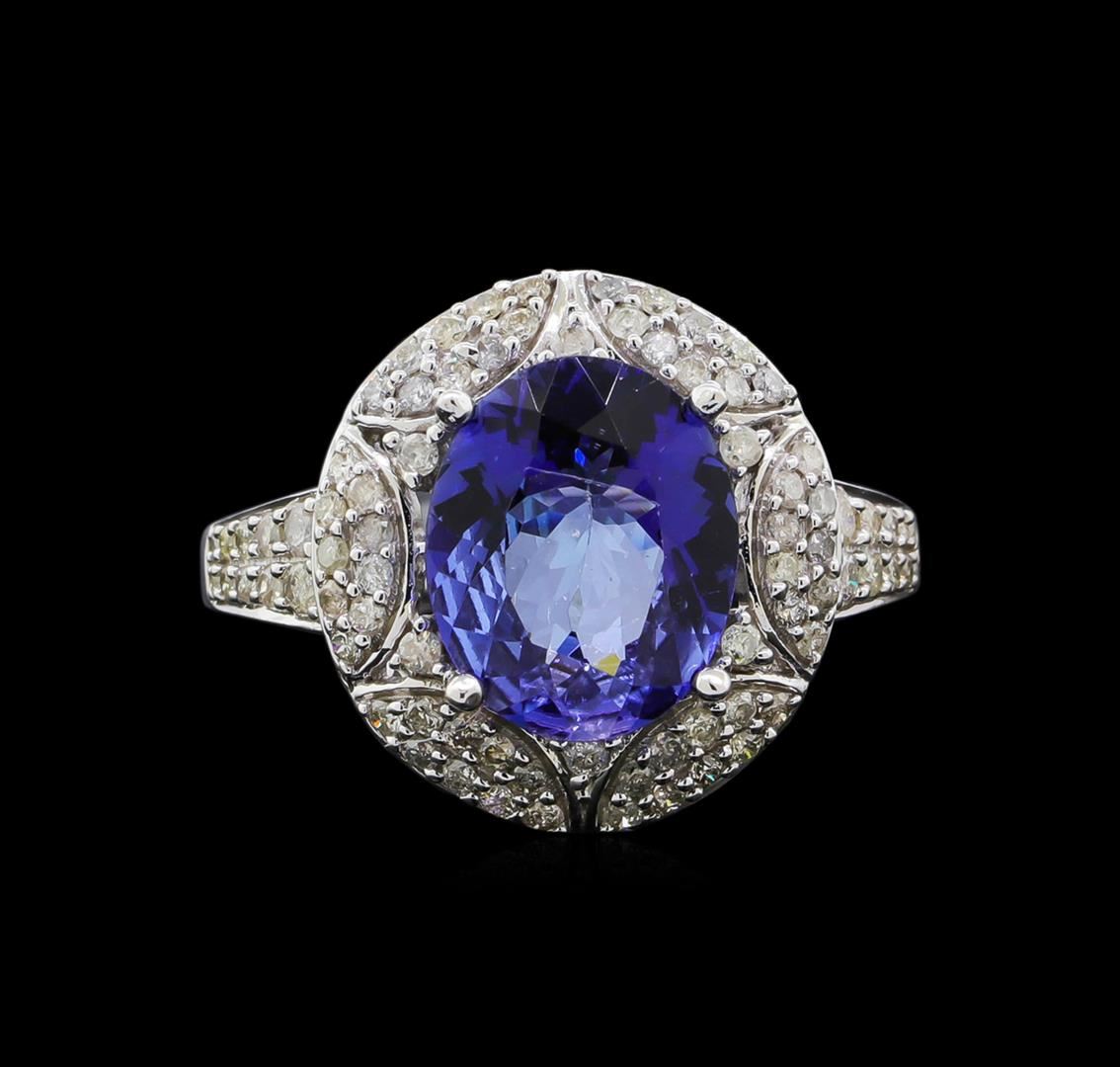 One electronically tested 14KT white gold ladies cast tanzanite and diamond ring with a bright polish finish. The featured tanzanite is set within a stylized diamond lattice supported by tapering diamond set shoulders, completed by a one and one-half millimeter wide band. Trademark is Orianne. Identified with markings of "14K". Condition is new, good workmanship. Containing: One prong set oval mixed cut natural tanzanite, measuring 10.85 x 8.75 x 4.35mm, approximate weight of 2.85ct., clarity is eye clean, type I, dark, very slightly grayish, violetish blue color, (GIA vB 7/3), cut is good. Natural Tanzanite, color enhanced due to cobalt coating. The presence of the coating prevents determining the stone's actual depth of color. Transmitting light with no distortion, transparent. Grading in the setting. The cobalt coated Tanzanite has a low tolerance to ultrasonic cleaning, and should not be cleaned using this method. Tanzanite is a very rare gemstone that is only found in the country of Tanzania. Originally discovered in 1967. Tiffany & Company, named the stone Tanzanite. It is found in the Usumburu Mountains that border the Umba Valley of northern Tanzania. Tanzanite occurs in gray, brown, violet, blue, reddish-purple, & green. The gem is interesting because of its exceptional pleochroism. Rotated in different directions a tanzanite will exhibit multiple changes of color. Eighty prong set round brilliant cut diamonds approximate total weight of 80 Stones = 0.57ct. Graded in the setting. Clarity: I-2 to I-3. Color: I - K. Total Weight of Colored Stones 2.85ct. Total Weight of Diamonds 0.57ct. Total Weight of Ring 4.23gm. AIG Appraised at $3,340.00.