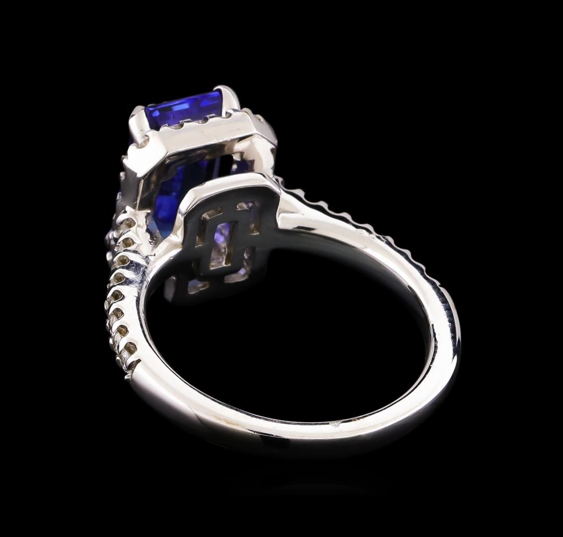 One electronically tested 14KT white gold lady's cast fashion ring with a halo with a bright polish finish. The featured lady's ring has a shank measuring 2.21 millimeters wide. Identified with markings of "14K". Condition is new, good workmanship. Containing: One prong set emerald step cut natural tanzanite, measuring 10.86 x 6.84 x 4.19mm, approximate weight of 2.85ct., clarity is eye clean, medium dark, moderately strong, violetish blue color, (GIA vB 6/4), cut is very good. Transmitting light with no distortion, transparent. Colored gemstones are presumed to have been subjected to commonly used enhancement processes. Graded in the setting. Thirty-Six prong set round brilliant cut diamonds, measuring 1.60 - 1.55 x 0.96mm (depth est.) approximate total weight of 36 Stones = 0.53ct. Graded in the setting. Clarity: SI-1 to SI-2. Color: H - I. Cut Good. Total Weight of Colored Stones 2.85ct. Total Weight of Diamonds 0.53ct. Total Weight of Ring 5.90gm. GAS Appraised at $6,735.00.