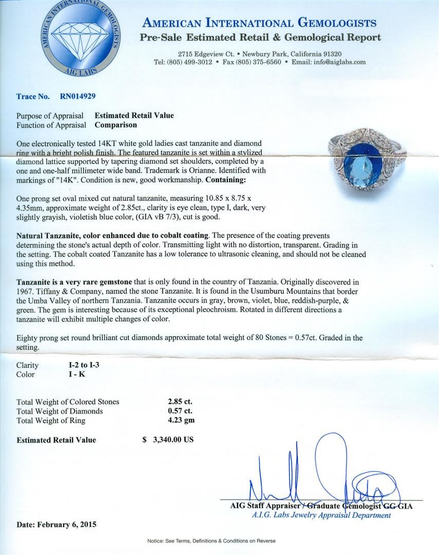 One electronically tested 14KT white gold ladies cast tanzanite and diamond ring with a bright polish finish. The featured tanzanite is set within a stylized diamond lattice supported by tapering diamond set shoulders, completed by a one and one-half millimeter wide band. Trademark is Orianne. Identified with markings of "14K". Condition is new, good workmanship. Containing: One prong set oval mixed cut natural tanzanite, measuring 10.85 x 8.75 x 4.35mm, approximate weight of 2.85ct., clarity is eye clean, type I, dark, very slightly grayish, violetish blue color, (GIA vB 7/3), cut is good. Natural Tanzanite, color enhanced due to cobalt coating. The presence of the coating prevents determining the stone's actual depth of color. Transmitting light with no distortion, transparent. Grading in the setting. The cobalt coated Tanzanite has a low tolerance to ultrasonic cleaning, and should not be cleaned using this method. Tanzanite is a very rare gemstone that is only found in the country of Tanzania. Originally discovered in 1967. Tiffany & Company, named the stone Tanzanite. It is found in the Usumburu Mountains that border the Umba Valley of northern Tanzania. Tanzanite occurs in gray, brown, violet, blue, reddish-purple, & green. The gem is interesting because of its exceptional pleochroism. Rotated in different directions a tanzanite will exhibit multiple changes of color. Eighty prong set round brilliant cut diamonds approximate total weight of 80 Stones = 0.57ct. Graded in the setting. Clarity: I-2 to I-3. Color: I - K. Total Weight of Colored Stones 2.85ct. Total Weight of Diamonds 0.57ct. Total Weight of Ring 4.23gm. AIG Appraised at $3,340.00.
