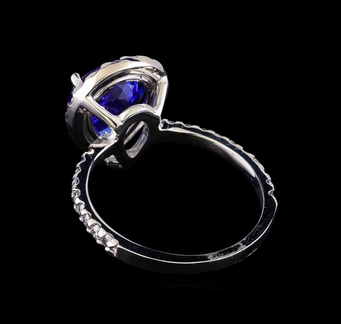 One electronically tested 14KT white gold lady's cast fashion ring with a basket halo with a bright polish finish. The featured lady's ring has a shank measuring 1.70 millimeters in width. Identified with markings of "K14". Condition is new, good workmanship. Containing: One prong set pear modified brilliant cut natural tanzanite, measuring 10.92 x 8.87 x 4.69mm, (depth est.) approximate weight of 2.85ct., clarity is eye clean, medium dark, moderately strong, bluish violet color, (GIA bV 6/4), cut is very good. Transmitting light with no distortion, transparent. Colored gemstones are presumed to have been subjected to commonly used enhancement processes. Graded in the setting. Thirty-Nine prong set round brilliant cut diamonds, measuring 1.60 - 1.50 x 0.96mm (depth est.) approximate total weight of 39 Stones = 0.55ct. Graded in the setting. Clarity: VS-2 to SI-2. Color: G - I. Cut Good. Total Weight of Colored Stones 2.85ct. Total Weight of Diamonds 0.55ct. Total Weight of Ring 3.50gm GAS Appraised at $6,355.00.
