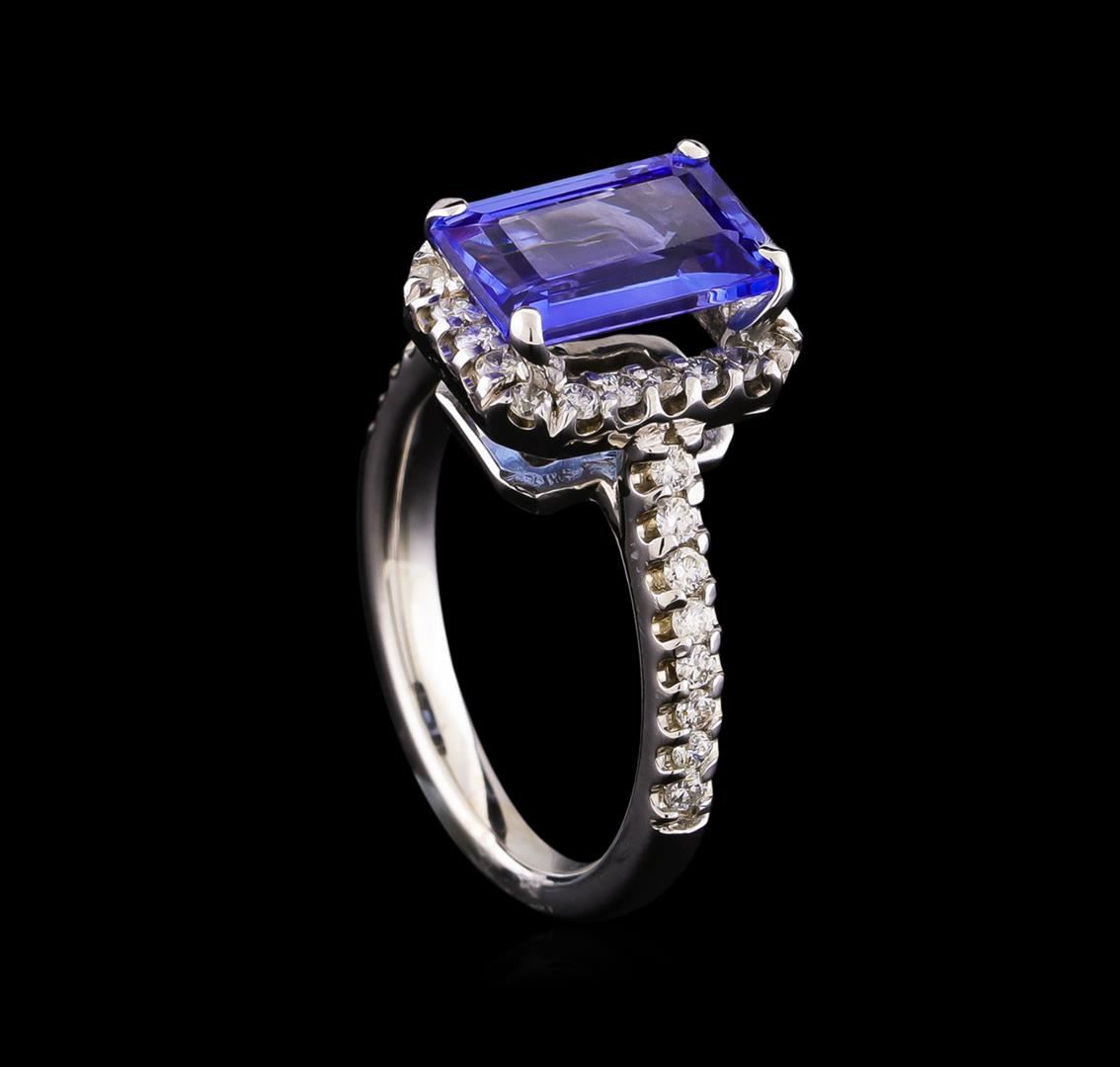 One electronically tested 14KT white gold lady's cast fashion ring with a halo with a bright polish finish. The featured lady's ring has a shank measuring 2.21 millimeters wide. Identified with markings of "14K". Condition is new, good workmanship. Containing: One prong set emerald step cut natural tanzanite, measuring 10.86 x 6.84 x 4.19mm, approximate weight of 2.85ct., clarity is eye clean, medium dark, moderately strong, violetish blue color, (GIA vB 6/4), cut is very good. Transmitting light with no distortion, transparent. Colored gemstones are presumed to have been subjected to commonly used enhancement processes. Graded in the setting. Thirty-Six prong set round brilliant cut diamonds, measuring 1.60 - 1.55 x 0.96mm (depth est.) approximate total weight of 36 Stones = 0.53ct. Graded in the setting. Clarity: SI-1 to SI-2. Color: H - I. Cut Good. Total Weight of Colored Stones 2.85ct. Total Weight of Diamonds 0.53ct. Total Weight of Ring 5.90gm. GAS Appraised at $6,735.00.