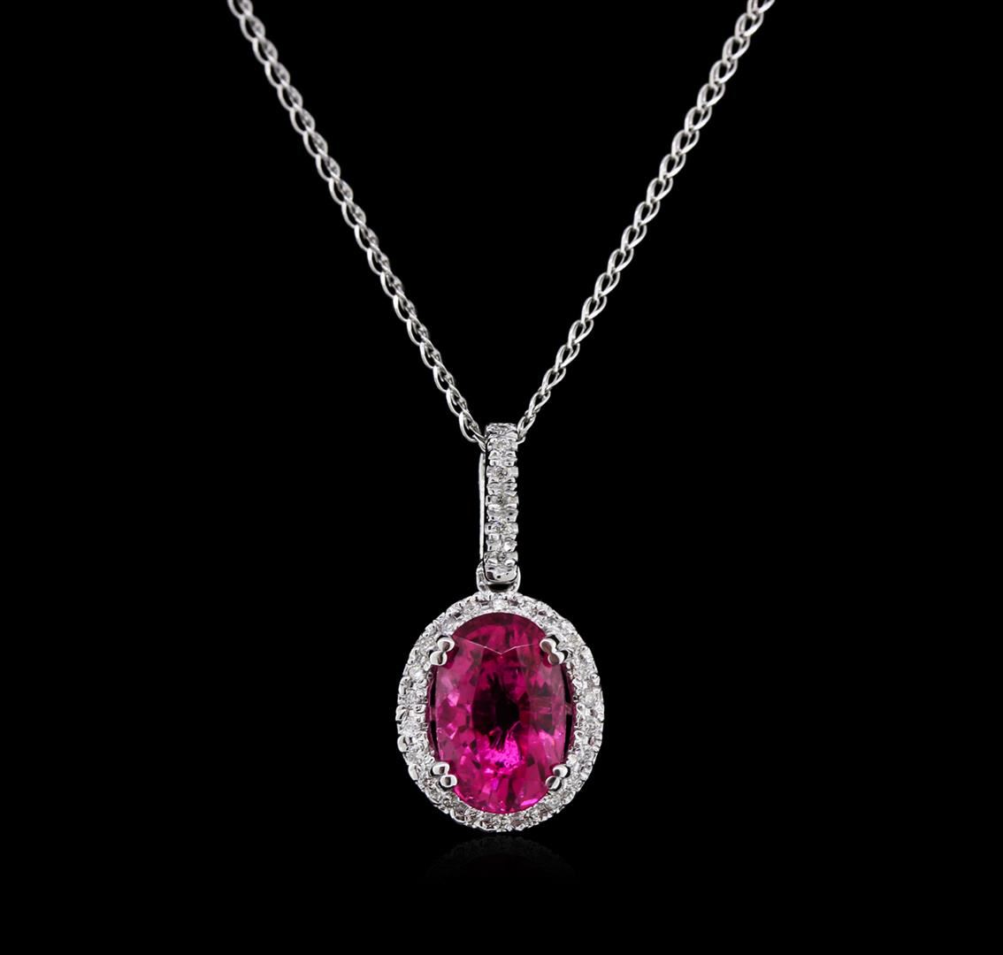One pendant with chain featuring: 14KT white gold weighing 2.06 grams containing one pink tourmaline with a total weight of 2.85ct and 28 diamonds with a total weight of 0.15ct.