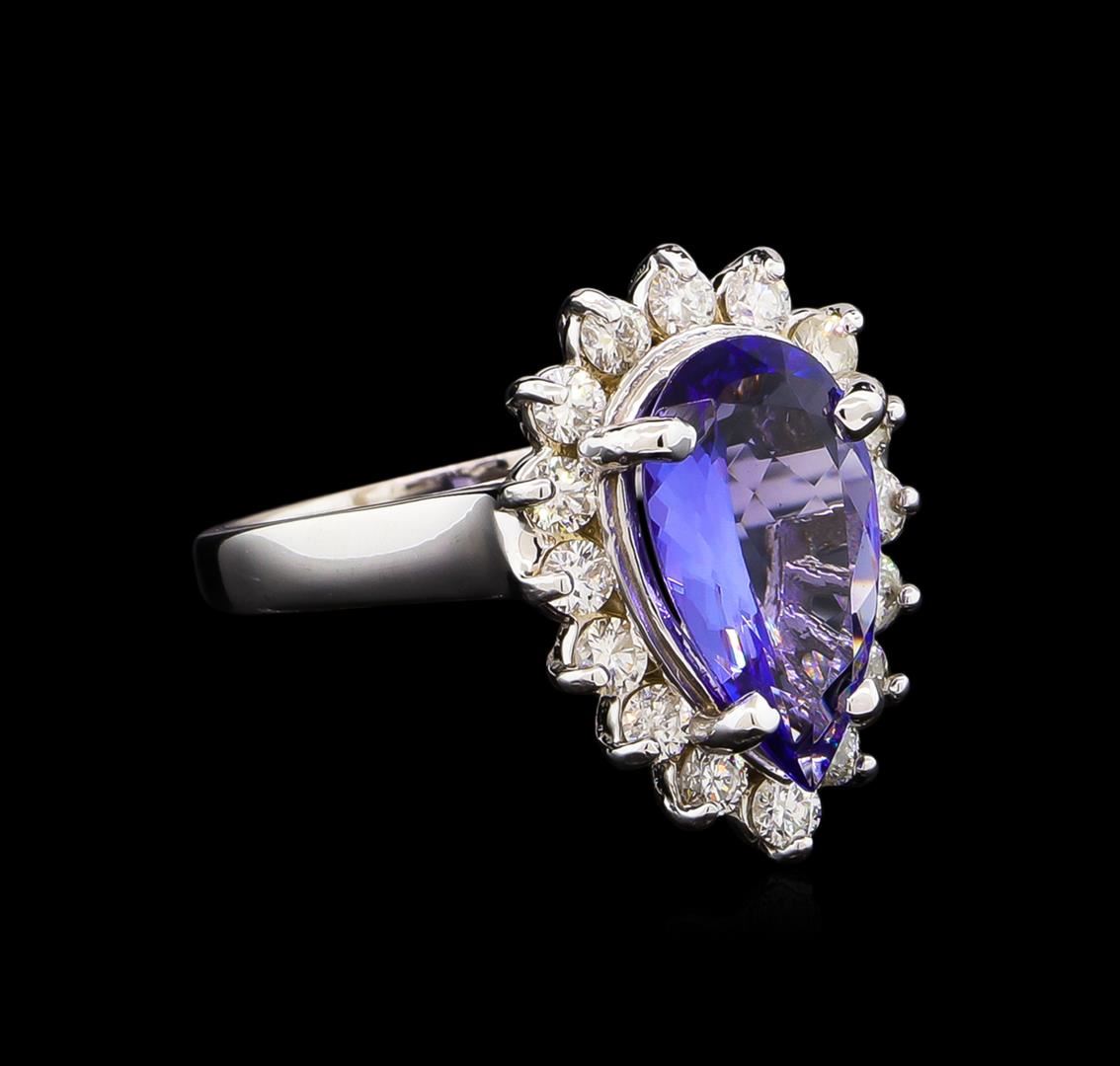 One electronically tested 14KT white gold lady's cast fashion ring with a basket halo with a bright polish finish. The featured lady's ring has a shank measuring 2.17 millimeters wide. Identified with markings of "14K". Condition is new, good workmanship. Containing: One prong set pear modified brilliant cut natural tanzanite, measuring 14.02 x 8.23 x 3.87mm, approximate weight of 2.85ct., clarity is eye clean, type I, medium dark, moderately strong, violetish blue color, (GIA vB 6/4), cut is very good. Transmitting light with no distortion, transparent. Colored gemstones are presumed to have been subjected to commonly used enhancement processes. Graded in the setting. Sixteen prong set round brilliant cut diamonds, measuring 2.40 - 2.30 x 1.41mm (depth est.) approximate total weight of 16 Stones = 0.75ct. Graded in the setting. Clarity: SI-1 to SI-2. Color: H - I. Cut Very Good. Total Weight of Colored Stones 2.85ct. Total Weight of Diamonds 0.75ct. Total Weight of Ring 6.30gm. GAS Appraised at $7,230.00.