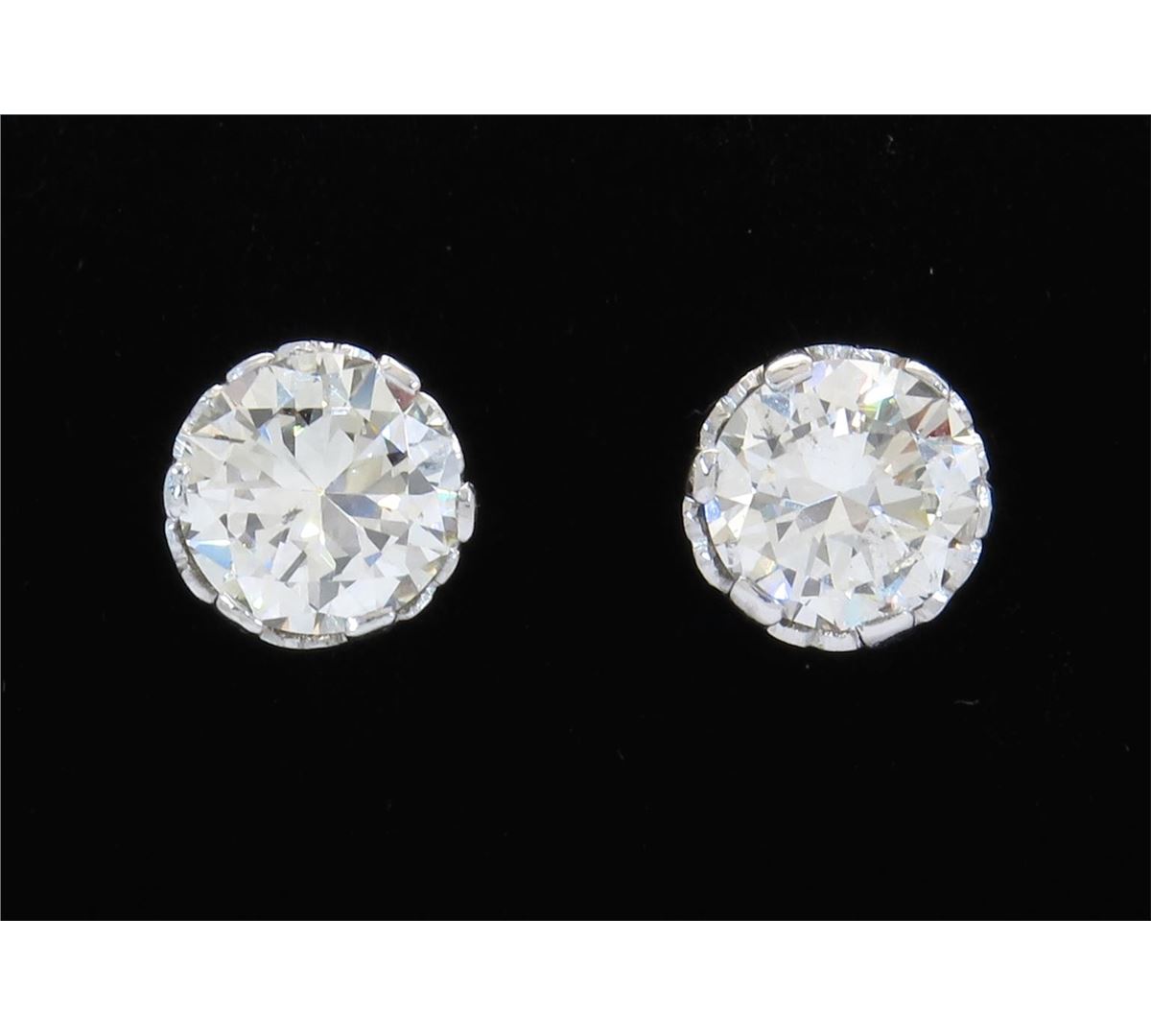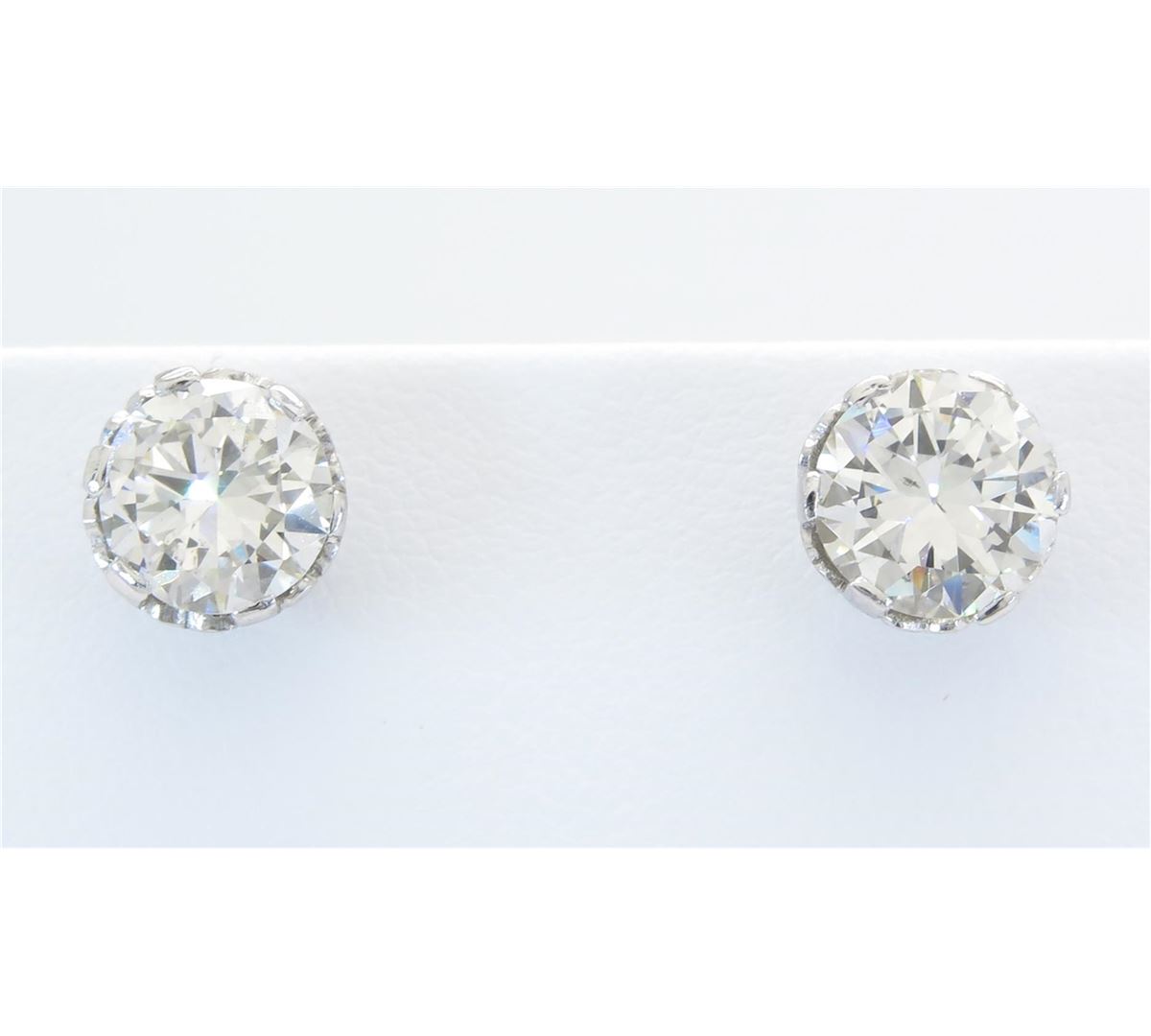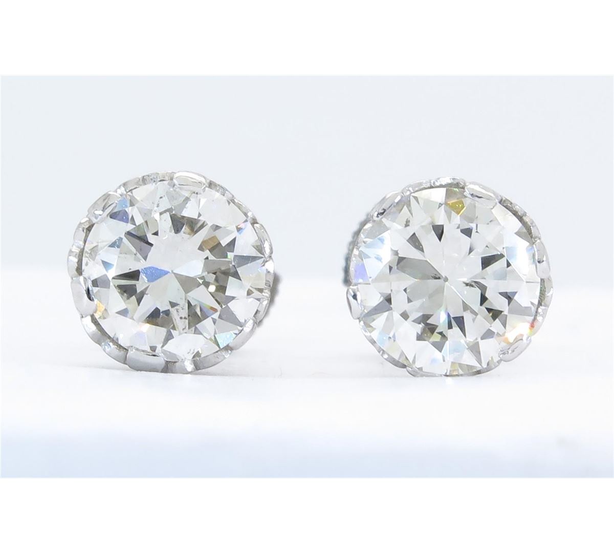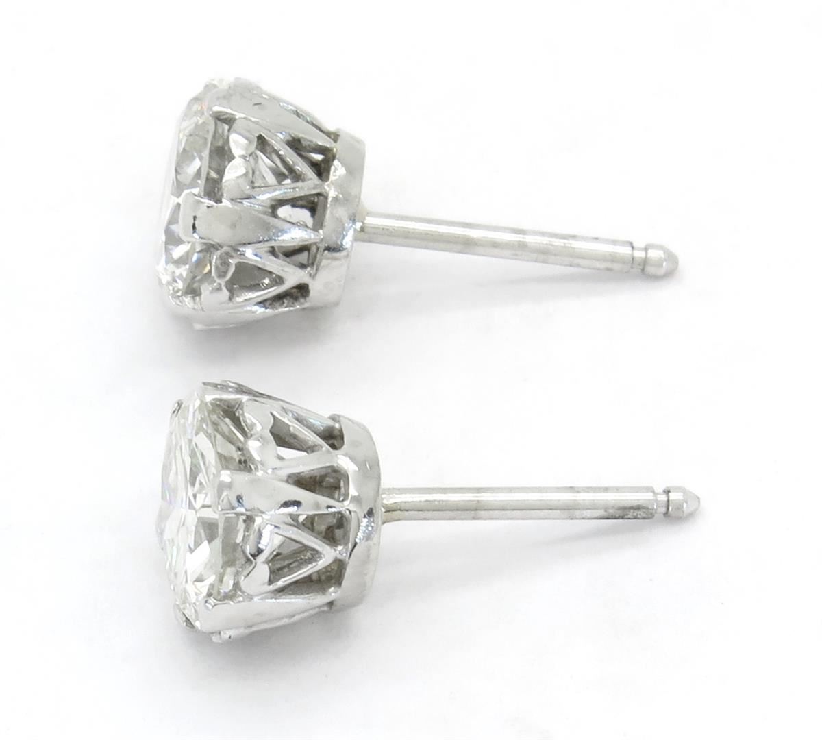 Two tested platinum diamond stud earrings. Containing: Two Round Transitional Cut Diamonds. Clarity: SI1, Color: H-I. Approximate total diamond weight: 2.85CTW. Diamonds are graded in the mounting, unless otherwise stated. Weight of earrings: 4.1 grams.