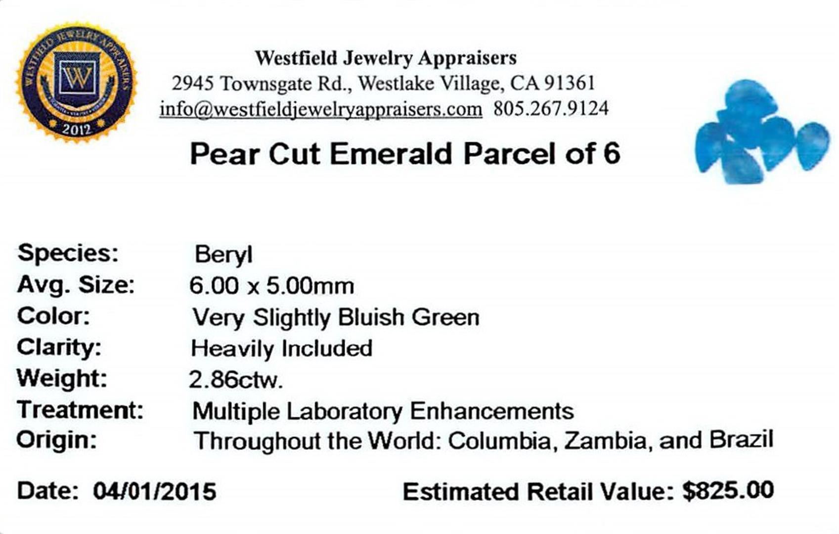 Six pear mixed cut natural emeralds exact total weight 2.86ct., clarity is heavily included, type III, medium dark, very slightly grayish, very slightly bluish green color, (GIA vslbG 6/3), cut is good. Westfield Appraised at $825.00.