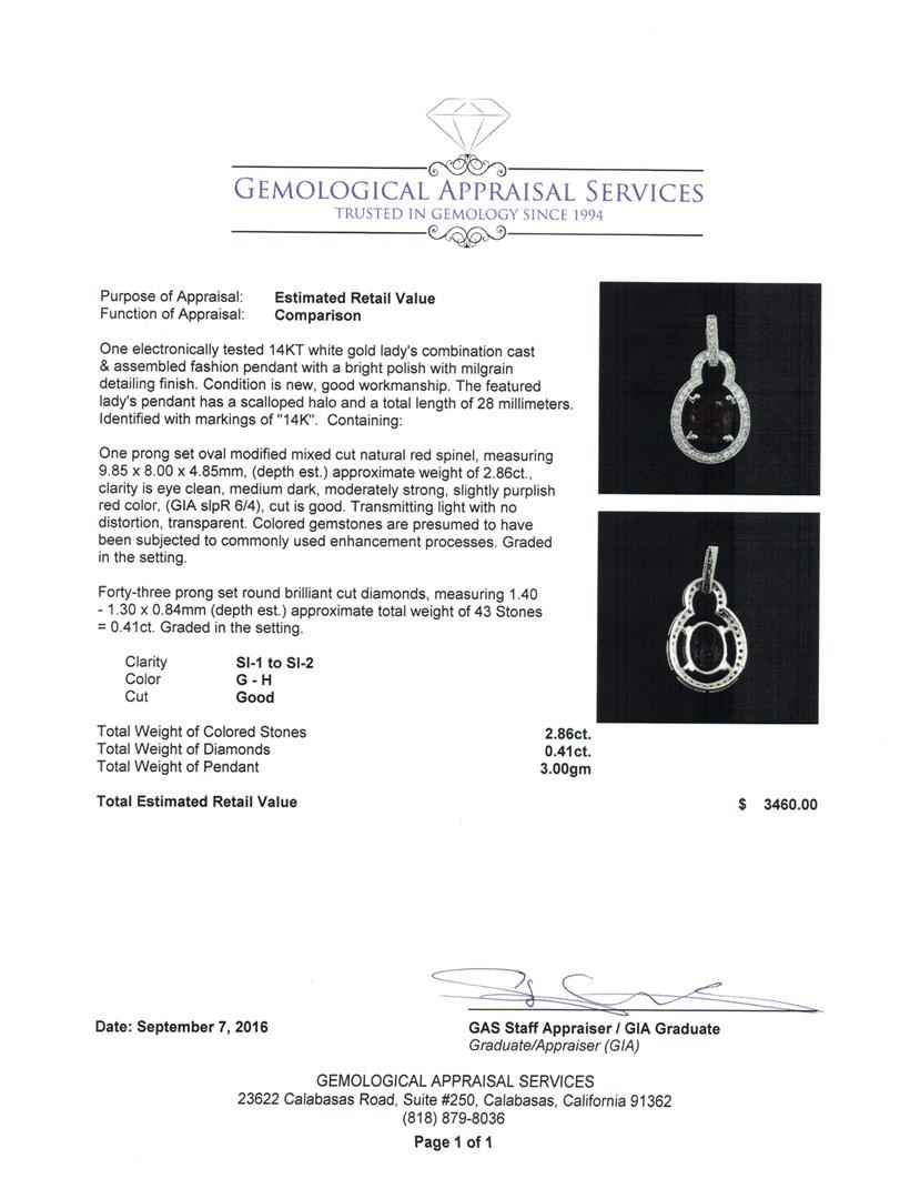 One electronically tested 14KT white gold lady's combination cast & assembled fashion pendant with a bright polish with milgrain detailing finish. The featured lady's pendant has a scalloped halo and a total length of 28 millimeters. Identified with markings of '14K'. Condition is new, good workmanship. Containing: One prong set oval modified mixed cut natural red spinel, measuring 9.85 x 8.00 x 4.85mm, (depth est.) approximate weight of 2.86ct., clarity is eye clean, medium dark, moderately strong, slightly purplish red color, (GIA slpR 6/4), cut is good. Transmitting light with no distortion, transparent. Colored gemstones are presumed to have been subjected to commonly used enhancement processes. Graded in the setting. Forty-Three prong set round brilliant cut diamonds, measuring 1.40 - 1.30 x 0.84mm (depth est.) approximate total weight of 43 Stones = 0.41ct. Graded in the setting. Clarity SI-1 to SI-2. Color: G - H Cut Good. Total Weight of Colored Stones 2.86ct.. Total Weight of Diamonds 0.41ct.. Total Weight of Pendant 3.00gm GAS Appraised at $3,460.00.