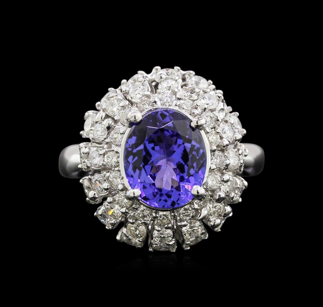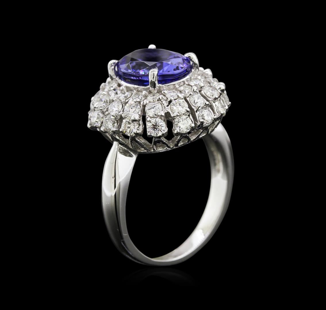 One electronically tested 14KT white gold lady's cast fashion ring with a halo with a bright polish finish. The featured ring has a 2.3mm wide shank Identified with markings of "14K". Condition is new, good workmanship. Containing: One prong set oval modified brilliant cut natural tanzanite, measuring 9.75 x 8.00 x 5.12mm, approximate weight of 2.86ct., clarity is eye clean, type I, medium dark, very slightly grayish, violetish blue color, (GIA vB 6/3), cut is very good. Transmitting light with no distortion, transparent. Colored gemstones are presumed to have been subjected to commonly used enhancement processes. Graded in the setting. Sixteen prong set round brilliant cut diamonds, measuring 2.40 - 2.35 x 1.55mm (depth est.) approximate total weight of 16 Stones = 0.80ct. Graded in the setting. Clarity: SI-1 to I-1. Color: H - I. Cut Good Sixteen prong set round brilliant cut diamonds, measuring 1.90 - 1.85 x 1.22mm (depth est.) approximate total weight of 16 Stones = 0.40ct. Graded in the setting. Clarity: SI-1 to I-1. Color: H - I. Cut Good Sixteen prong set round brilliant cut diamonds, measuring 1.50 - 1.45 x 0.96mm (depth est.) approximate total weight of 16 Stones = 0.22ct. Graded in the setting. Clarity: SI-1 to I-1. Color: H - I. Cut Good. Total Weight of Colored Stones 2.86ct. Total Weight of Diamonds 1.42ct. Total Weight of Ring 7.00gm. GAS Appraised at $8,625.00.