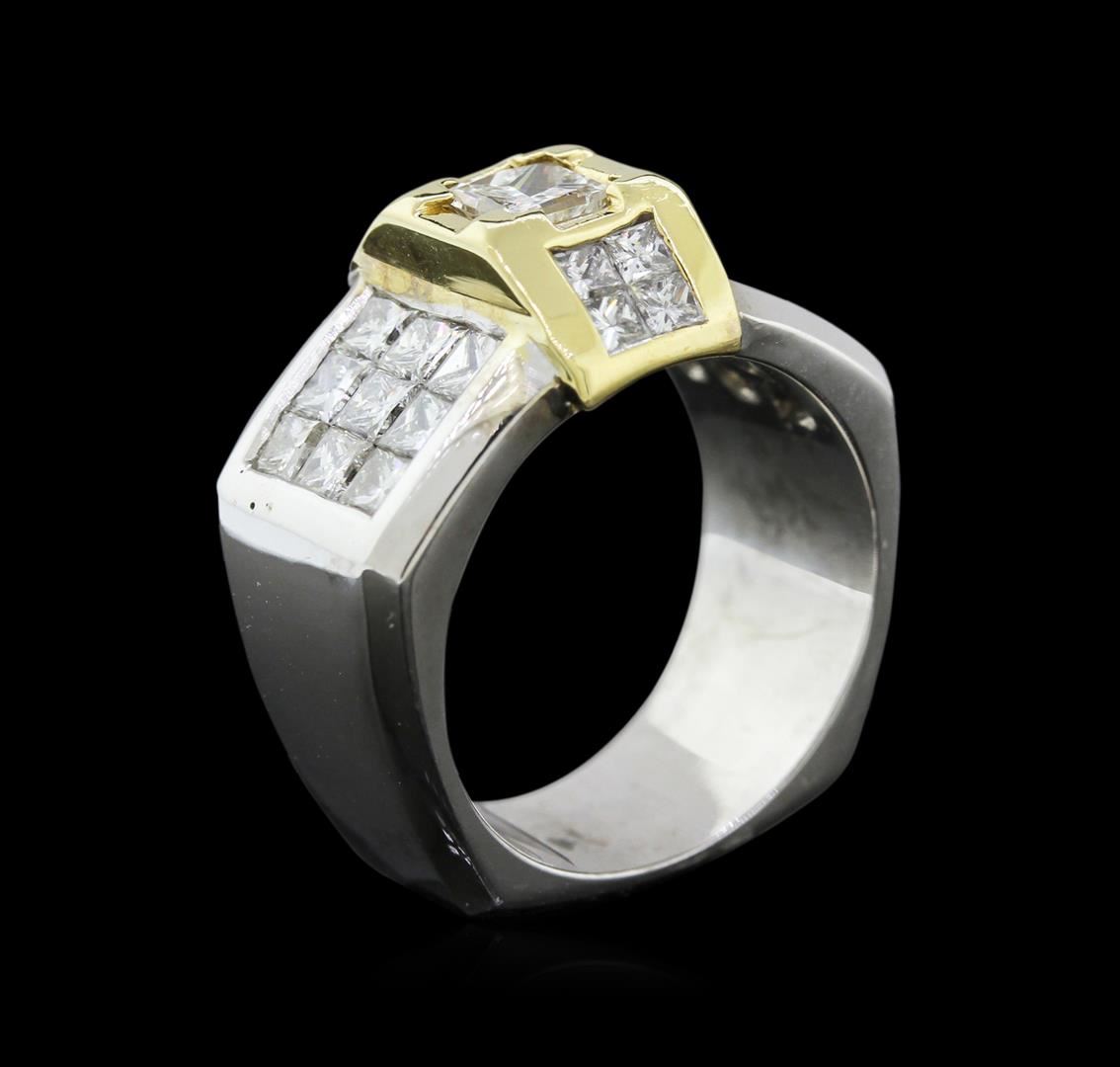 One electronically tested 18KT white and yellow gold ladies cast diamond ring with a bright polish finish. Identified with markings of "18K". Condition is new. Containing: One prong set princess cut diamond, measuring 3.90 x 3.90 x 2.93mm (depth est.) approximate weight of 0.37ct. Clarity: VS-2. Color: G, Cut is Very Good. Twenty-Six invisible set princess cut diamonds, measuring 2.50 x 2.50 x 1.88mm (depth est.) approximate total weight of 26 Stones = 2.50ct. Clarity: VS-2. Color: G - H, Cut is Very Good. Diamonds are graded in the mounting, unless otherwise stated. Total Weight of Diamonds 2.87ct. Total Weight of Ring 13.70gm. GGL Appraised at $6,100.00.