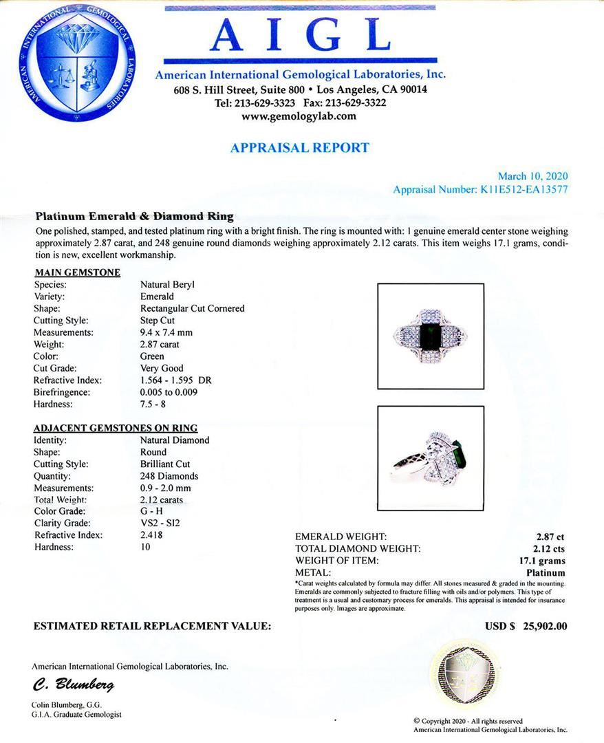 Platinum Emerald & Diamond Ring One polished, stamped, and tested platinum ring with a bright finish. The ring is mounted with: 1 genuine emerald center stone weighing approximately 2.87 carat, and 248 genuine round diamonds weighing approximately 2.12 c