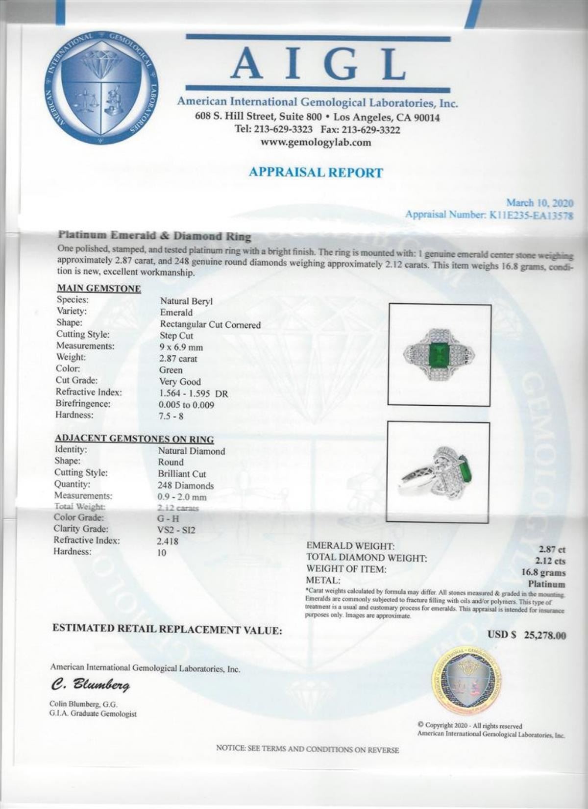 One 2.87ct Emerald and Diamond Ring - Platinum. AIG certified. See Appraisal for more details. AIG Appraised.