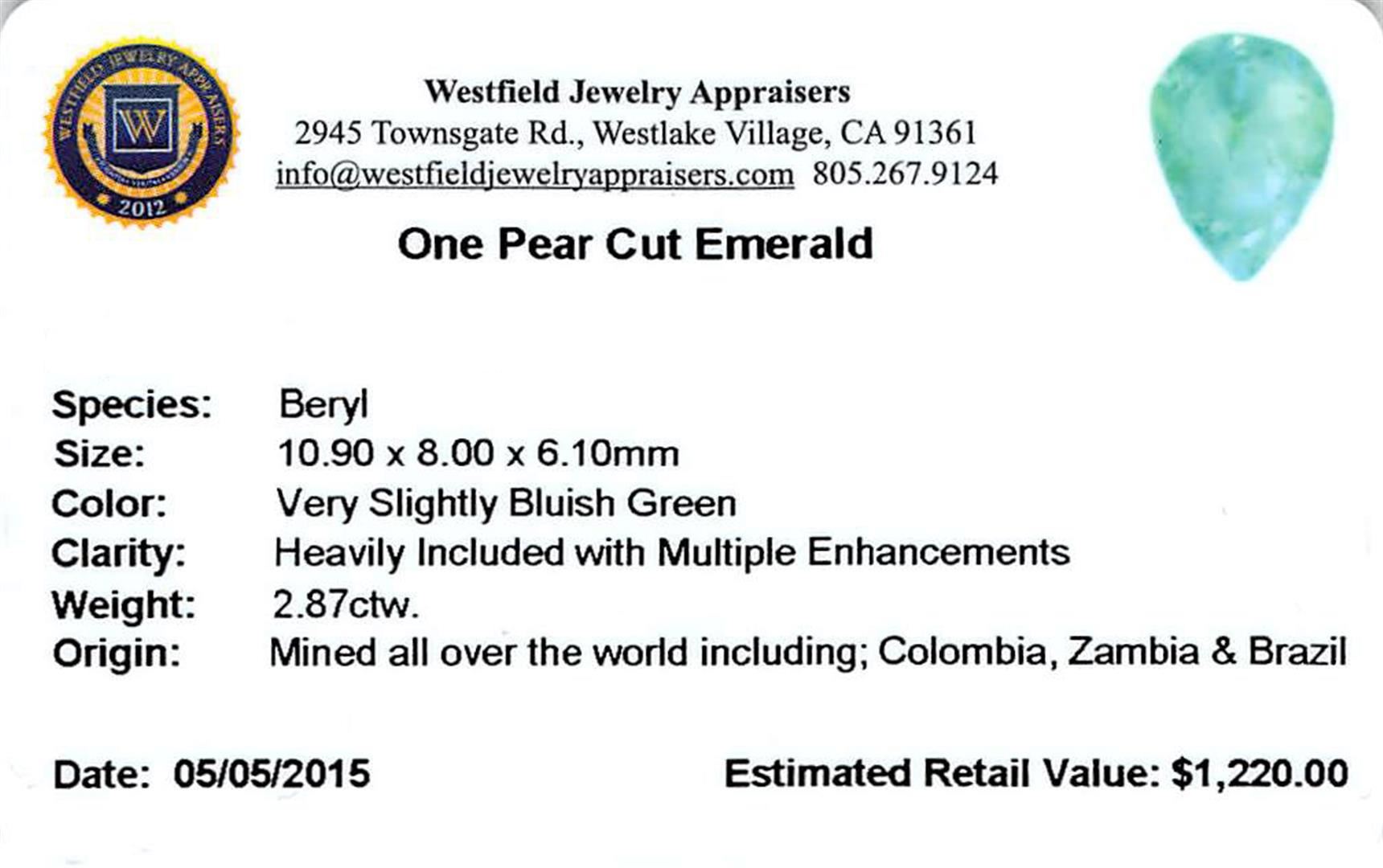One pear cut natural emerald, measuring 10.90 x 8.00 x 6.10mm, exact weight 2.87ct., clarity is moderately included, type III, very slightly grayish, very slightly bluish green color, (GIA vslbG 0/3)_x000D_ Westfield Appraised.