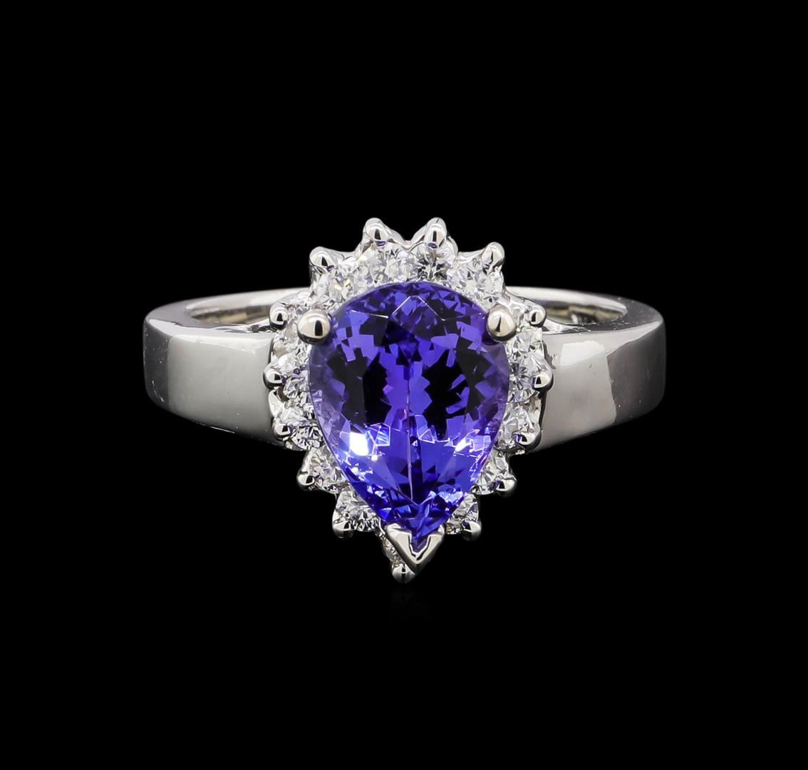 One electronically tested 14KT white gold lady's cast fashion ring with a basket halo with a bright polish finish. The featured lady's ring has a shank measuring 2.78 millimeters in width. Identified with markings of '14K'. Condition is new, good workmanship. Containing: One prong set pear modified brilliant cut natural tanzanite, measuring 10.50 x 7.85 x 5.51mm, (depth est.) approximate weight of 2.87ct., clarity is eye clean, medium dark, moderately strong, bluish violet color, (GIA bV 6/4), cut is very good. Transmitting light with no distortion, transparent. Colored gemstones are presumed to have been subjected to commonly used enhancement processes. Graded in the setting. Fifteen prong set round brilliant cut diamonds, measuring 2.10 - 2.00 x 1.25mm (depth est.) approximate total weight of 15 Stones = 0.48ct. Graded in the setting. Clarity SI-1 to SI-2. Color: H - I Cut Good. Total Weight of Colored Stones 2.87ct.. Total Weight of Diamonds 0.48ct.. Total Weight of Ring 6.90gm. GAS Appraised at $6,505.00.