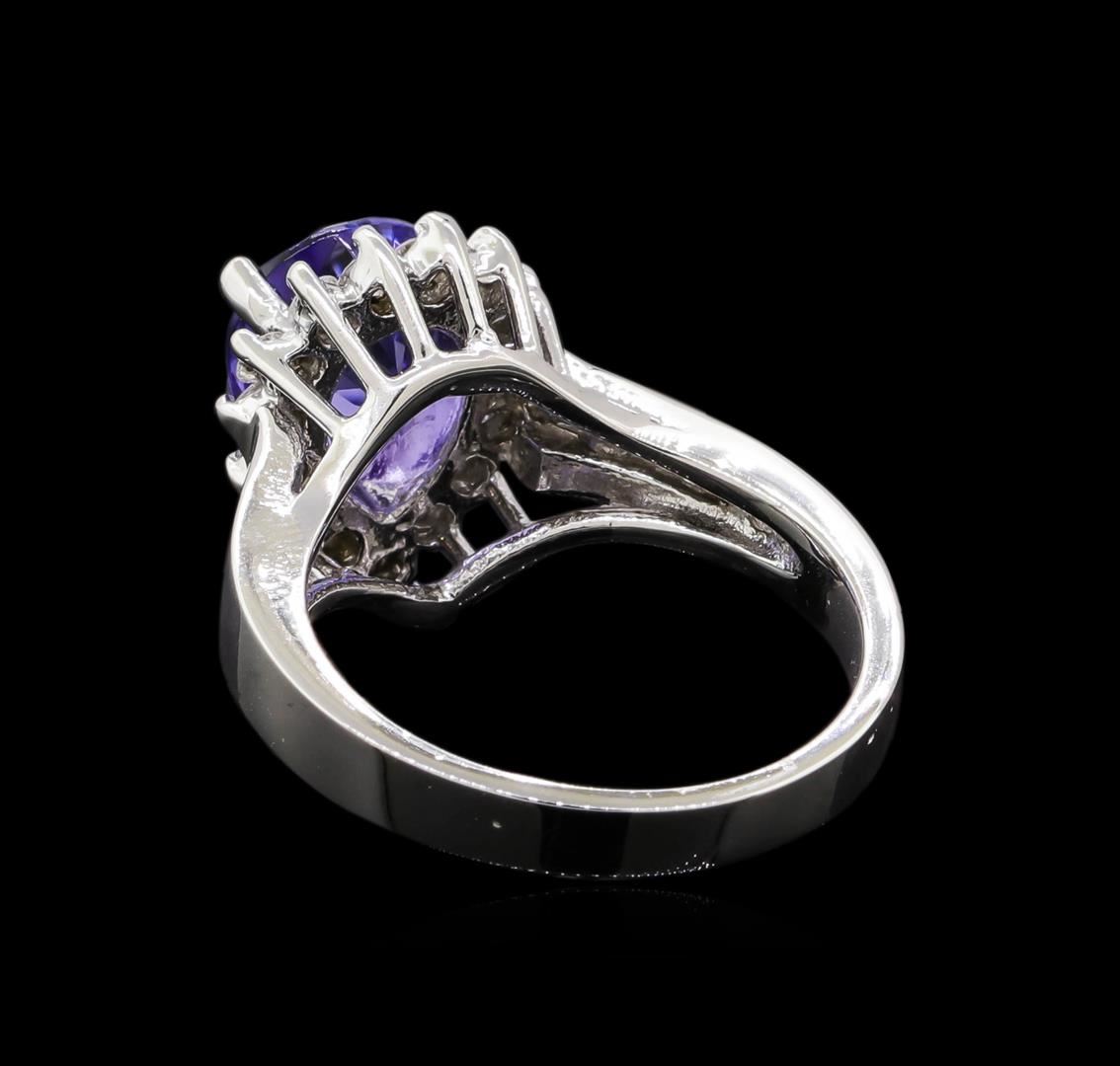 One electronically tested 14KT white gold lady's cast fashion ring with a basket halo with a bright polish finish. The featured lady's ring has a shank measuring 2.78 millimeters in width. Identified with markings of '14K'. Condition is new, good workmanship. Containing: One prong set pear modified brilliant cut natural tanzanite, measuring 10.50 x 7.85 x 5.51mm, (depth est.) approximate weight of 2.87ct., clarity is eye clean, medium dark, moderately strong, bluish violet color, (GIA bV 6/4), cut is very good. Transmitting light with no distortion, transparent. Colored gemstones are presumed to have been subjected to commonly used enhancement processes. Graded in the setting. Fifteen prong set round brilliant cut diamonds, measuring 2.10 - 2.00 x 1.25mm (depth est.) approximate total weight of 15 Stones = 0.48ct. Graded in the setting. Clarity SI-1 to SI-2. Color: H - I Cut Good. Total Weight of Colored Stones 2.87ct.. Total Weight of Diamonds 0.48ct.. Total Weight of Ring 6.90gm. GAS Appraised at $6,505.00.