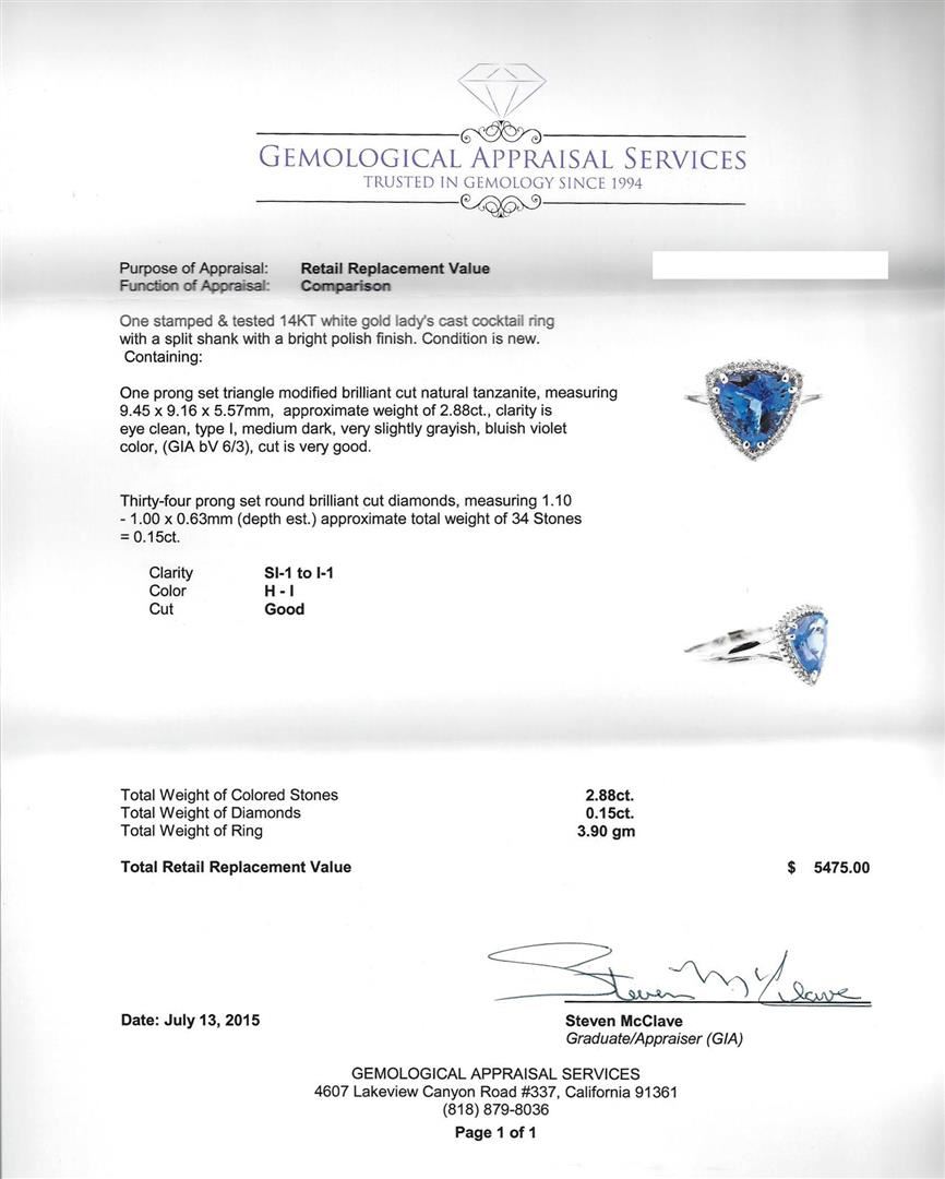 One stamped & tested 14KT white gold lady's cast cocktail ring with a split shank with a bright polish finish. Condition is new. Containing: One prong set triangle modified brilliant cut natural tanzanite, measuring 9.45 x 9.16 x 5.57mm, approximate weight of 2.88ct., clarity is eye clean, type I, medium dark, very slightly grayish, bluish violet color, (GIA bV 6/3), cut is very good. Thirty-four prong set round brilliant cut diamonds, measuring 1.10 - 1.00 x 0.63mm (depth est.) approximate total weight of 34 Stones = 0.15ct. Clarity: SI-1 to I-1. Color: H - I. Cut: Good. Total Weight of Colored Stones: 2.88ct. Total Weight of Diamonds: 0.15ct. Total Weight of Ring: 3.90 gm. GAS Appraised at $5,475.00.